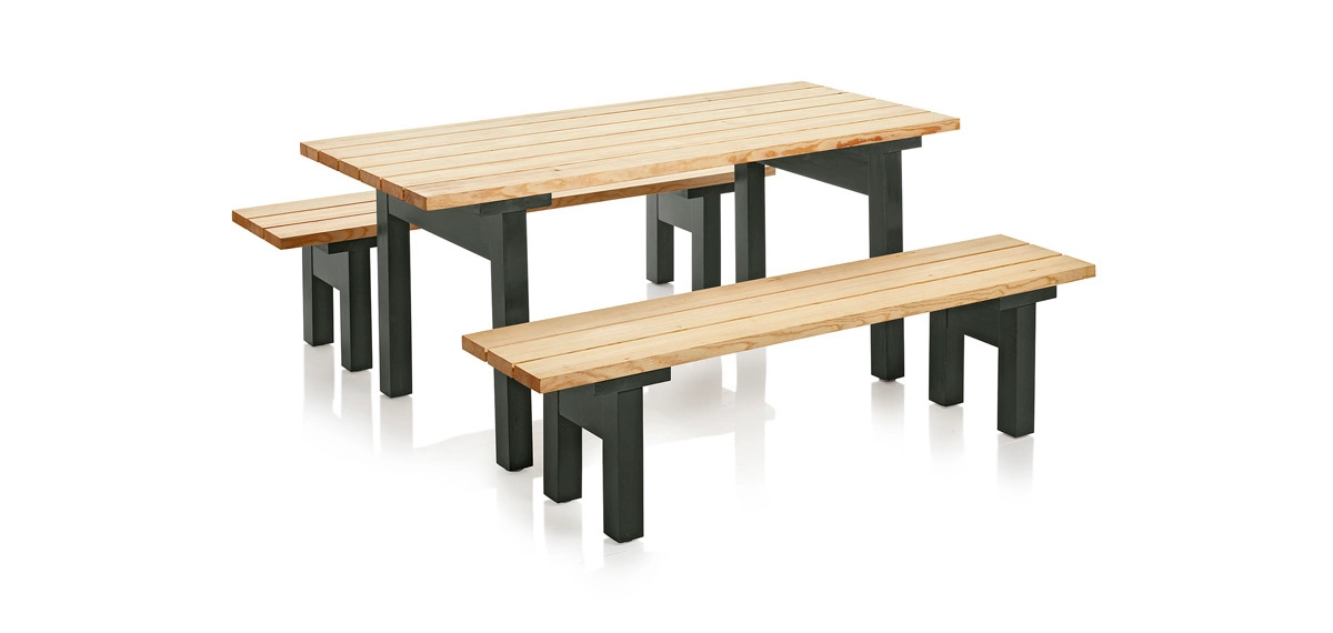 This efficient table and bench set showcases the beauty of natural wood grain, and its surfaces can also be combined with underlying supports made from stained timber. The set is in sync with contemporary architecture and landscape design, where untreated wood continues to be a popular material. Bakgård is an ideal choice for design-conscious landscapes and contemporary architecture.