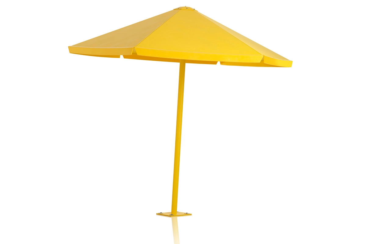 The Four Seasons parasol is a sturdy year-round design that deflects the heat of the sun and provides shelter from the rain. Made from sheet steel edged with silicon, the parasol bolts securely to the ground to withstand gusts of wind and inclement weather. Designed with a striking profile that tilts away from the base, Four Seasons adds a contemporary element to gardens and courtyards, or any environment where shelter and shade are needed.