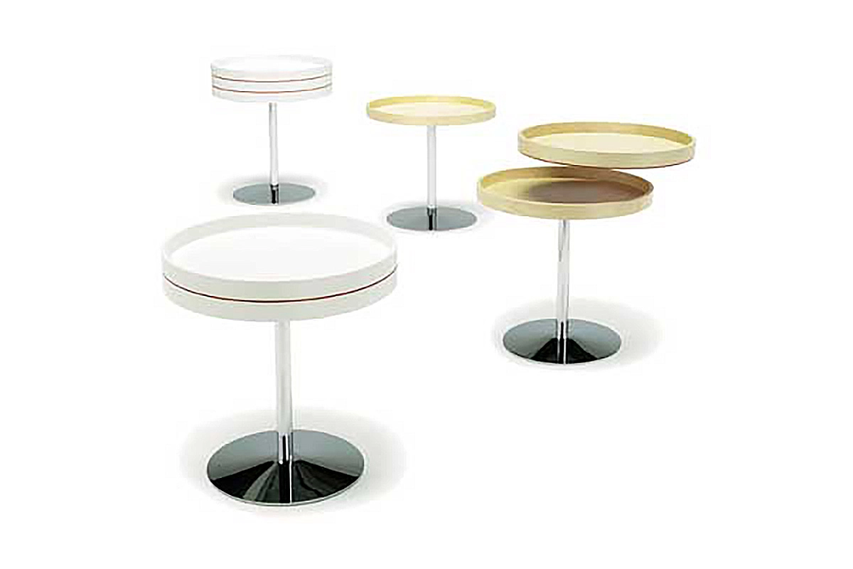 The TRAY tabletops are in natural or lacquered wood. Upper tabletop works as removable tray. Underside of tray has an anti-glide surface in polyurethane. The foot is in chromed metal.