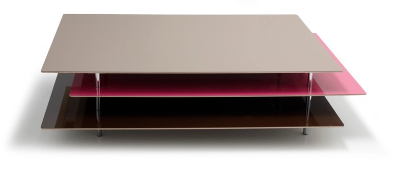 Etage consists of three coffee tables in different colors and sizes. At first glance, they appear to almost hover above the floor. The three table tops protrude in different directions like balconies, revealing their underlying architectural inspiration: the table is a mini-building without walls—a building under construction. The different levels create spaces for magazines and remote control devices.
