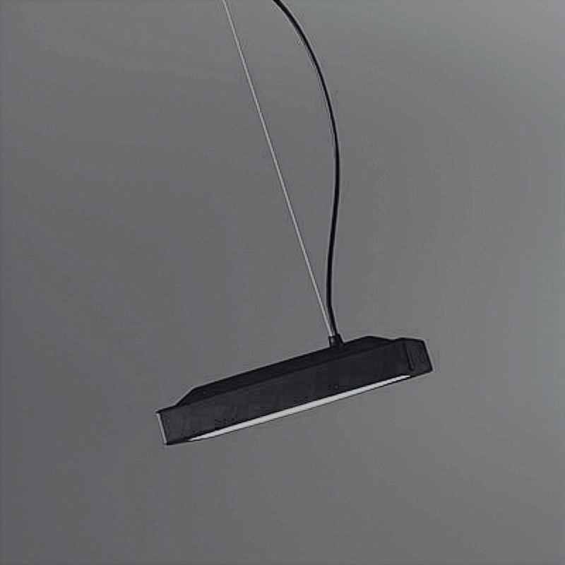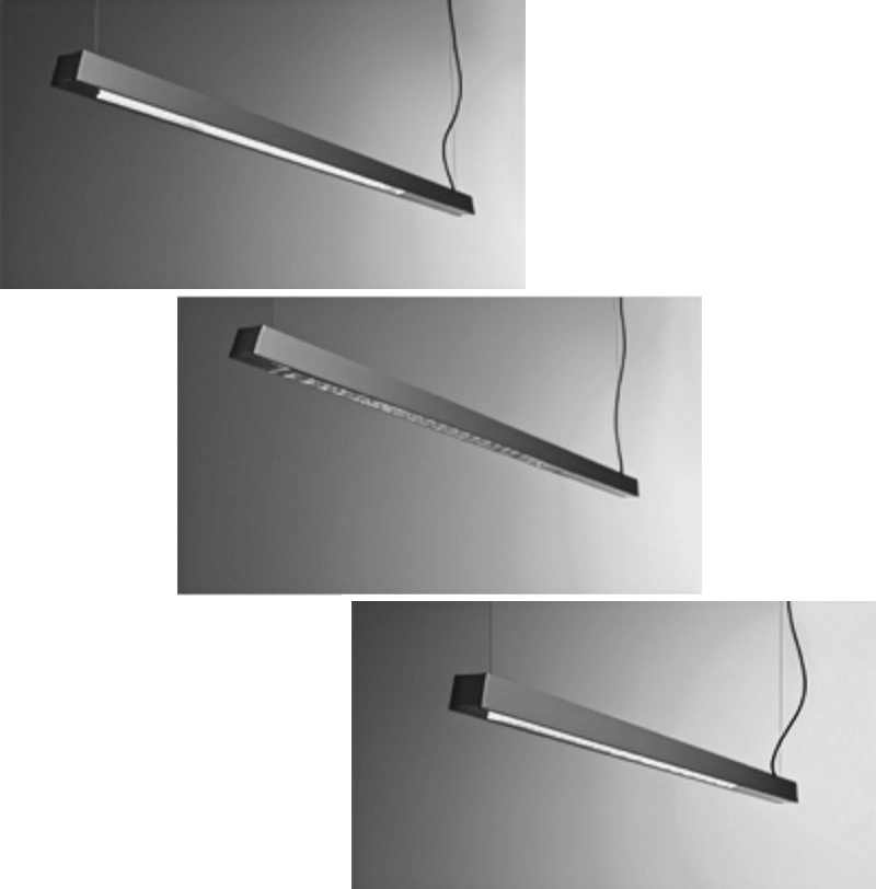 Suspended fitting, three variants. With T5 fluorescent tubes and lens optics or miro raster. Also available with LEDs. LINS is made of anodised aluminium.