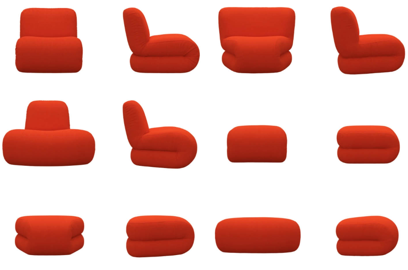 It can be employed as a solitary easy chair or combined to create a playful variety of seating configurations. The collection includes a linking table, whose geometrical edginess contrasts with the sofa’s laid-back personality.