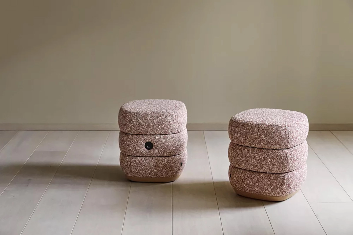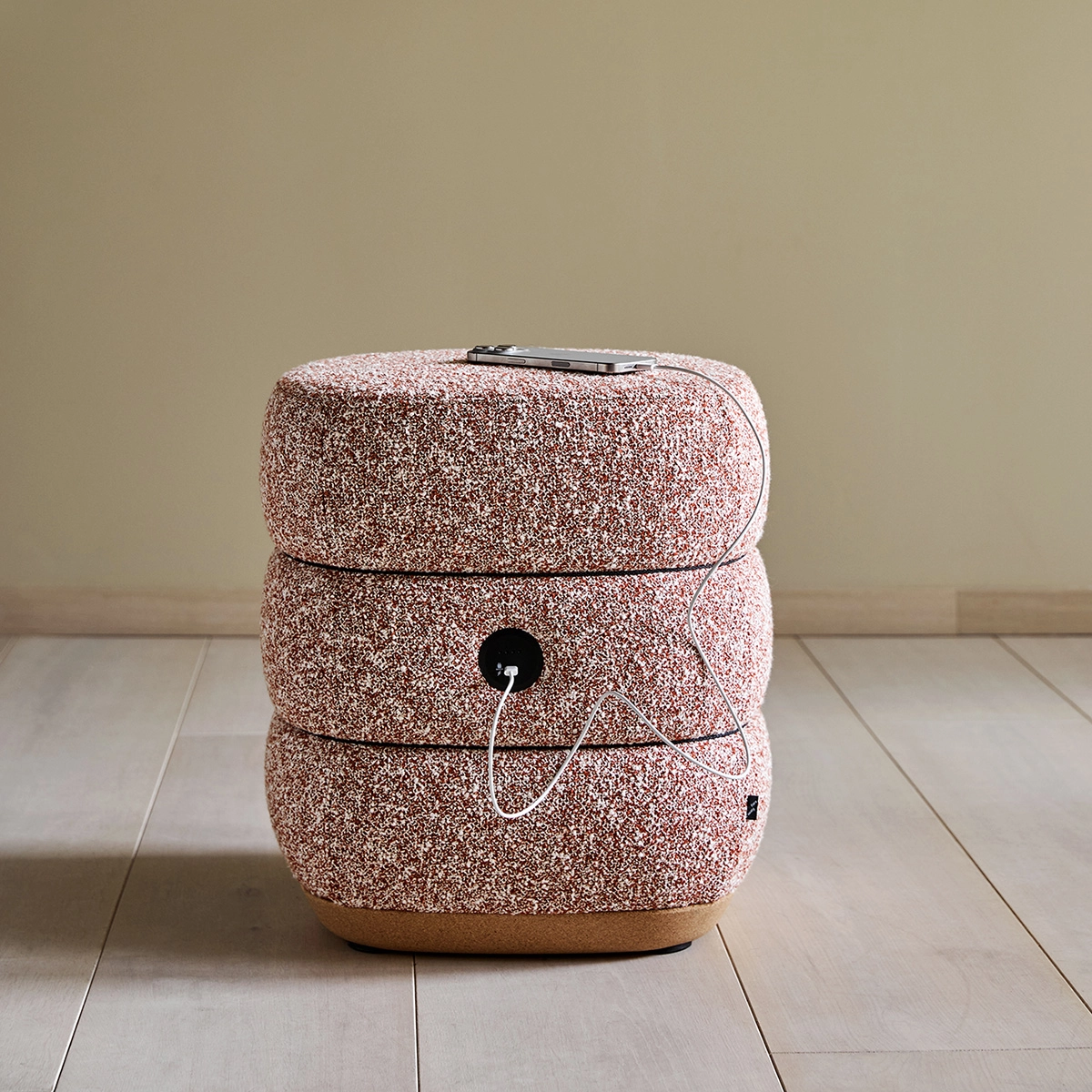 The ottoman’s environmental profile is as strong as its expression: It is made of renewable cork, Nordic cardboard, moulded cold foam, and sliders in recycled plastic. It is 100% separable with just four screws and thus developed with longevity and circularity in mind.