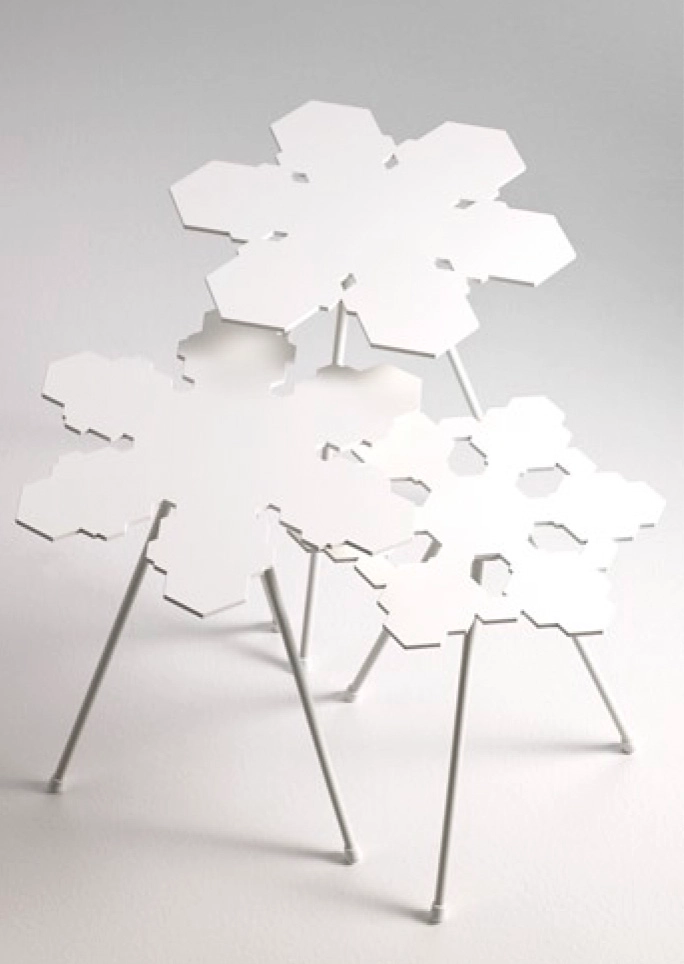 Snowflakes is a small, useful table which can be combined by using several by a sofa or just one by the bed. The table is available in three different heights in order to increase the possible variations and usages. Every table top is unique.