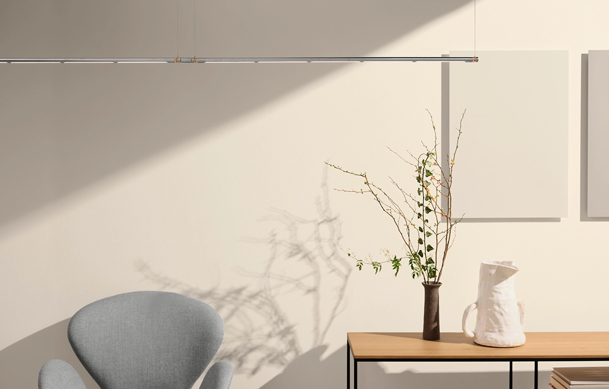 Applying design to everyday, functional objects, Oneline™ is a purposeful pendant light with an artistic expression. The minimalist pendant, from Fritz Hansen, designed in collaboration with artist Kasper Friis Kjeldgaard, is shaped from metal into a sleek line of light, suspended from silver-tone cables to elegantly illuminate space.