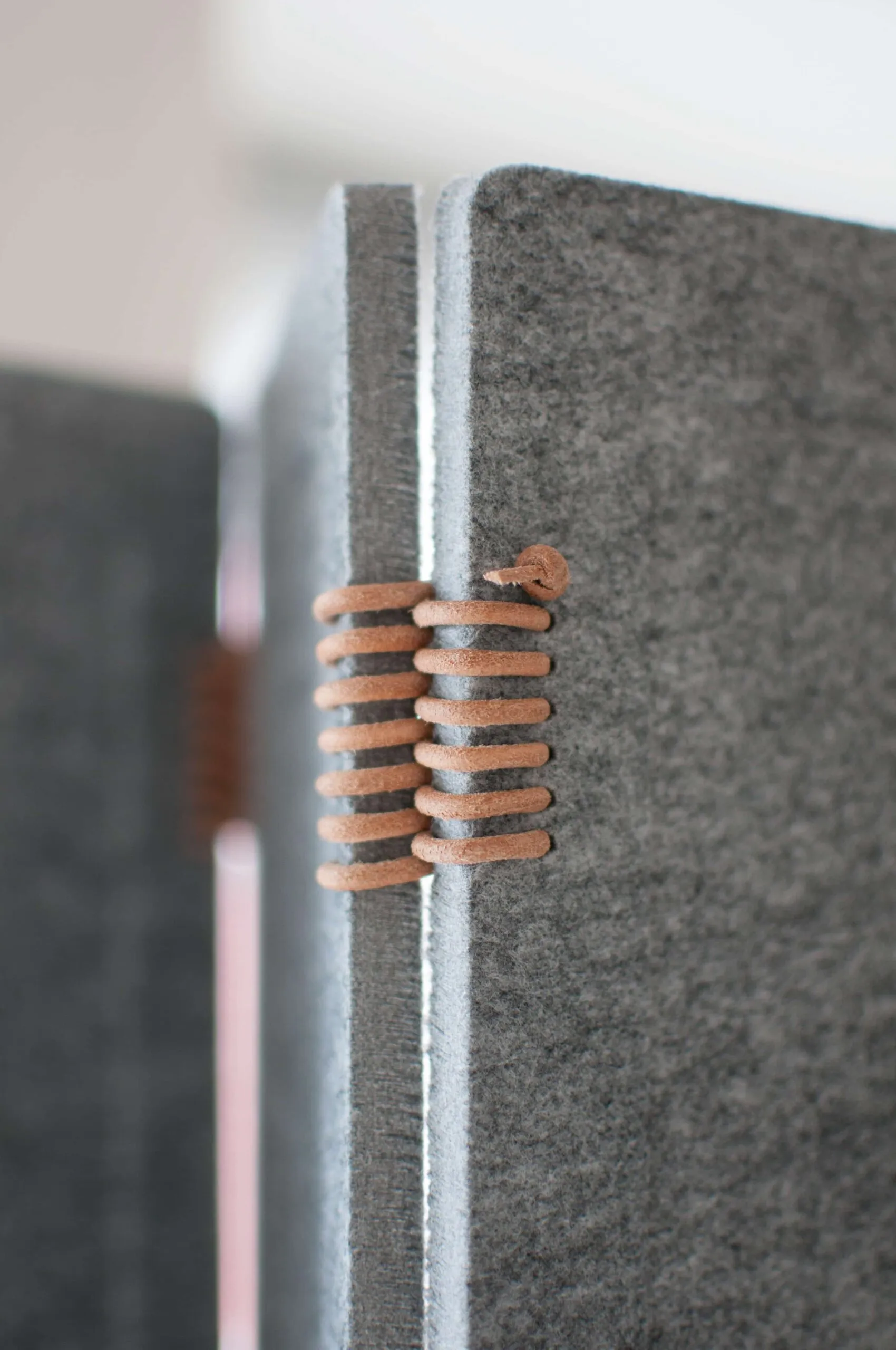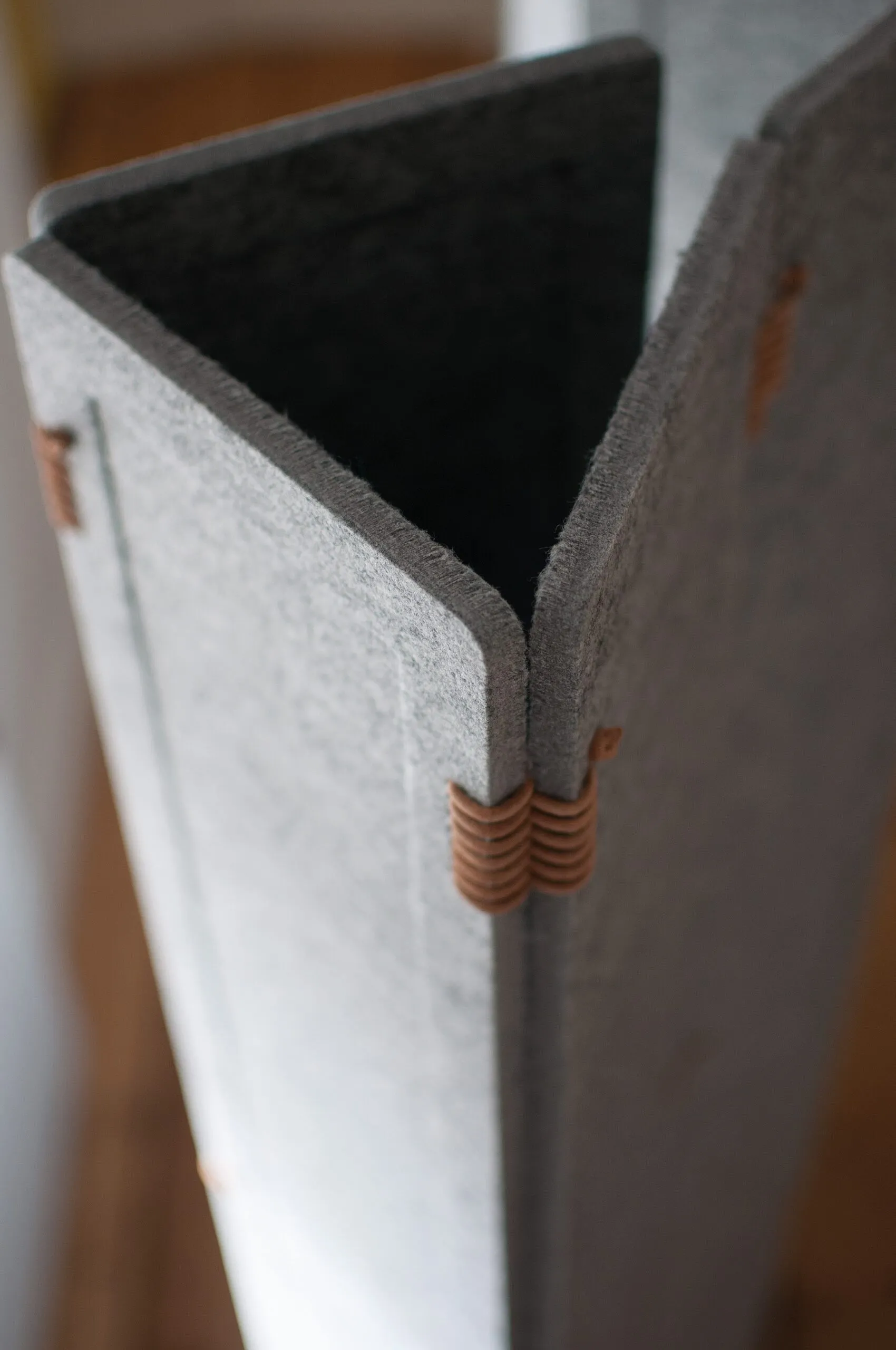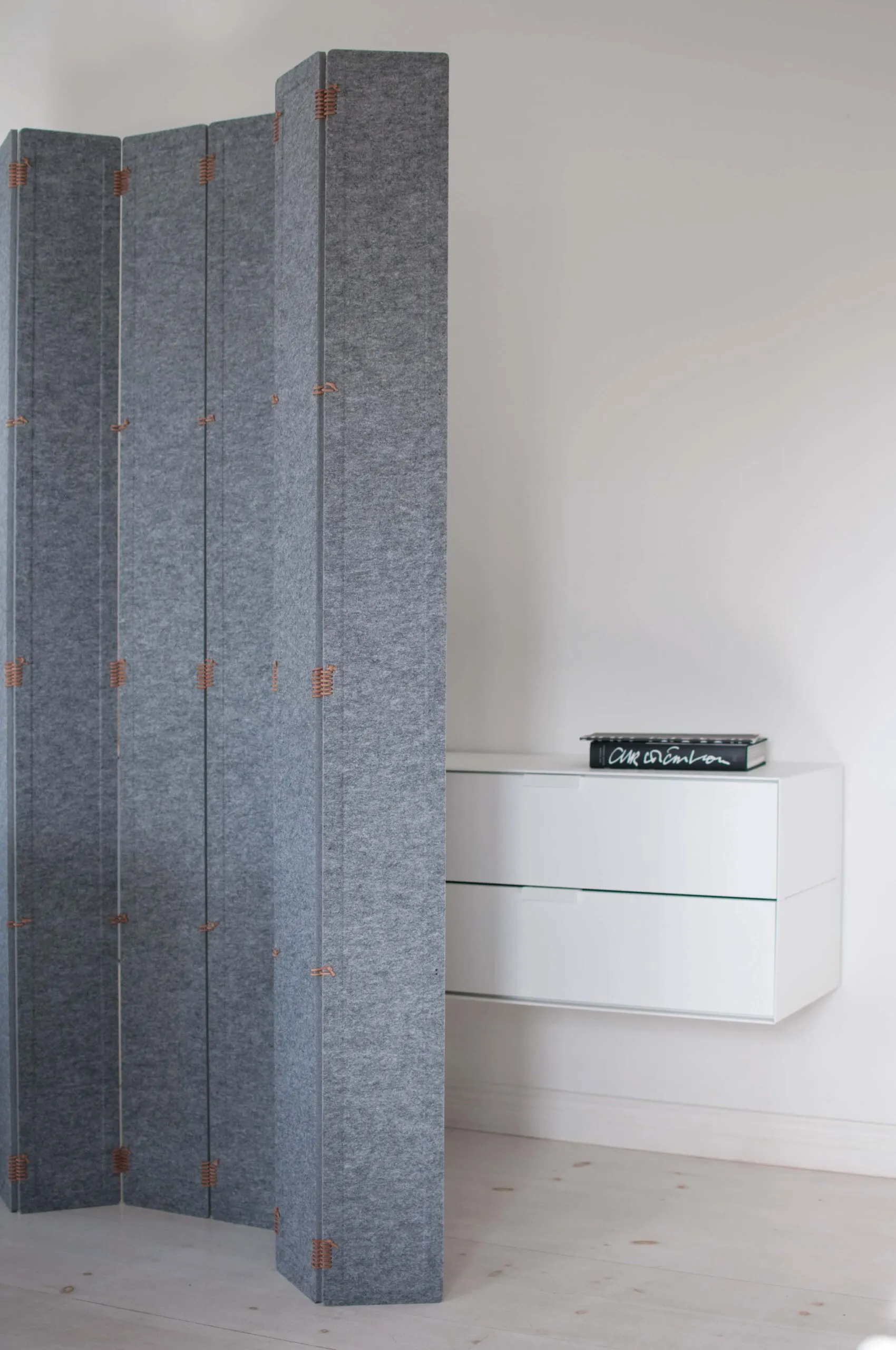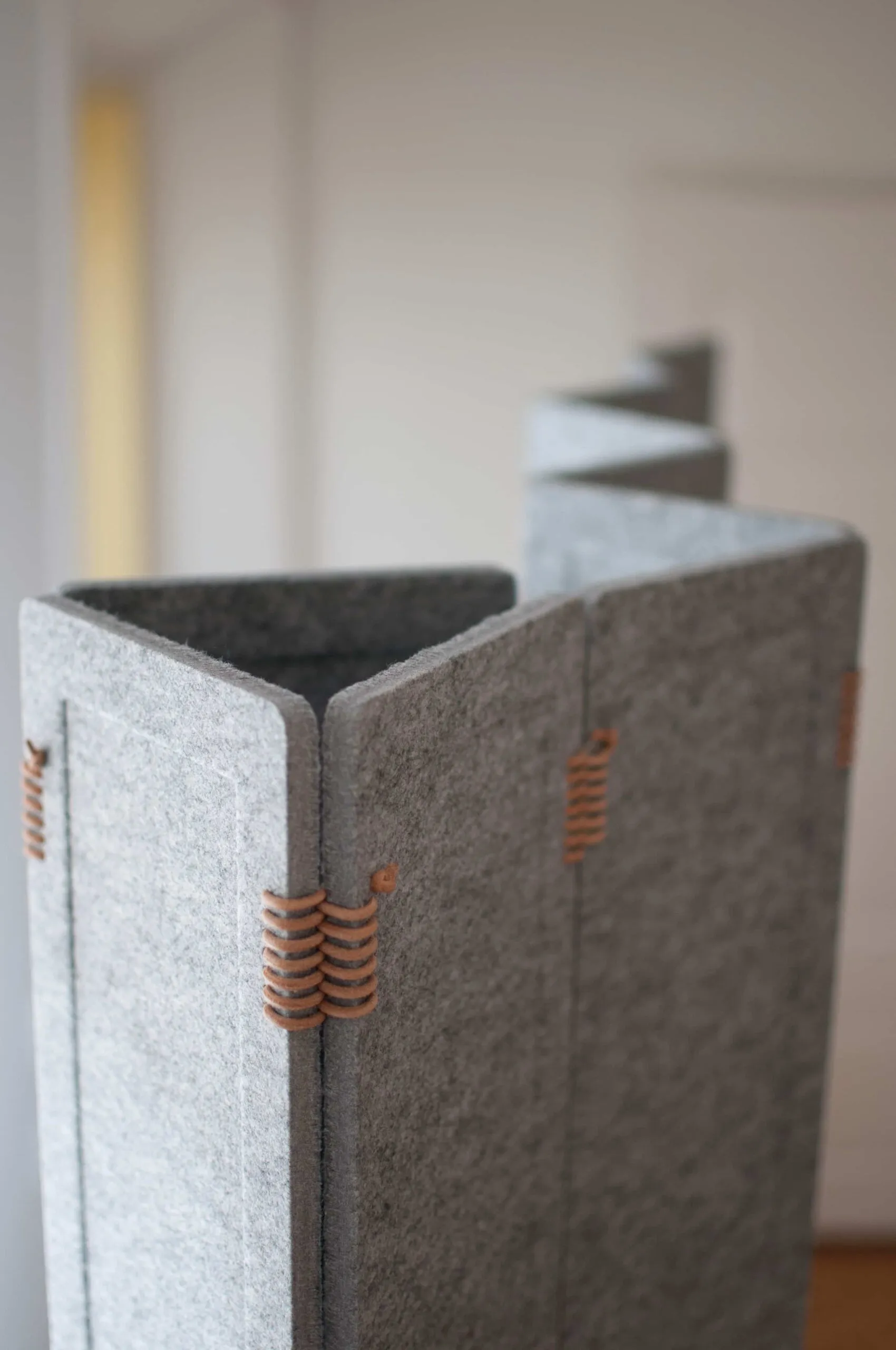 Ann Idstein has worked with Swiss designer Christophe Marchand for many years. The latest creation in this cooperation is a floor standing room divider, called Paravent. The product is made of individual slats made out of a 12mm thick felt material. These slats are then connected by a 3mm leather cord. The cord thus works as connector and hinge at the same time, making the Paravent flexible both in length and in shape. It is available in 2 shades of grey and in 2 heights; 1300 and 1800 mm. Inspired by urban life in small apartments, where rooms often have to fill several parallel purposes, the Paravent is designed to create and divide space when needed.