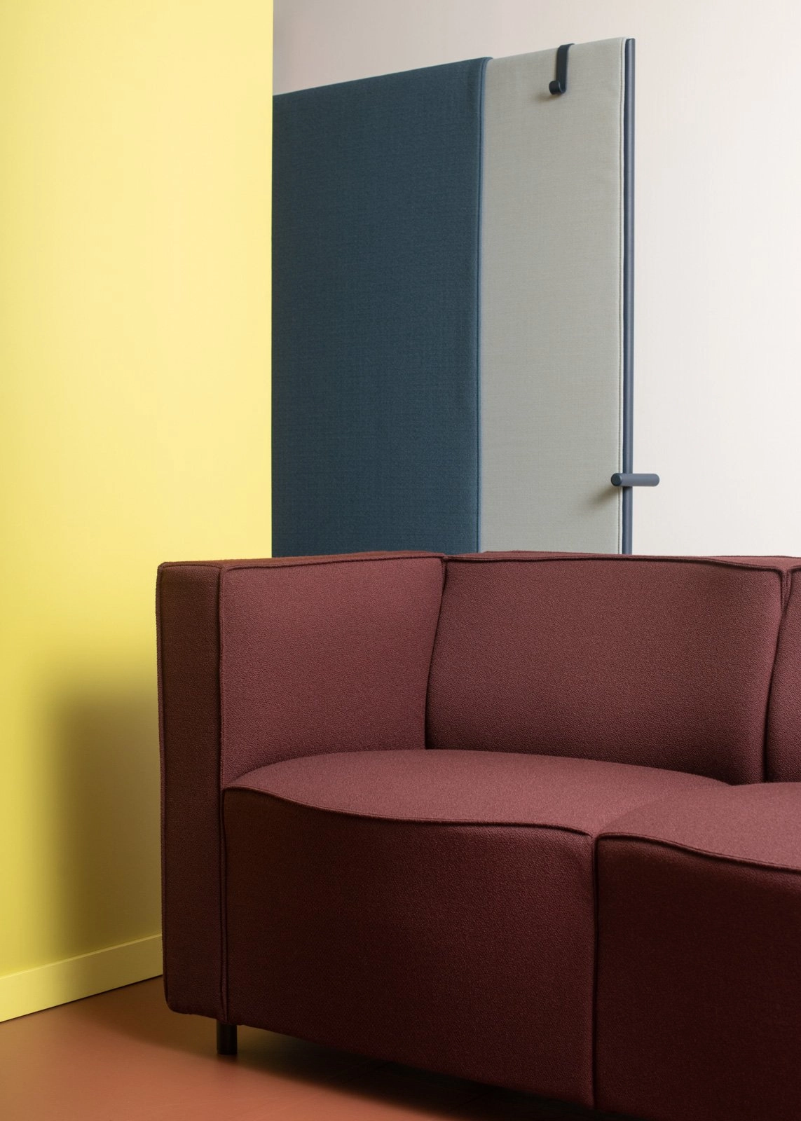 Exquisite lines and sophisticated playfulness. Pauline Deltour’s armchair Pauline and sound absorber Thelma, designed for Offecct …