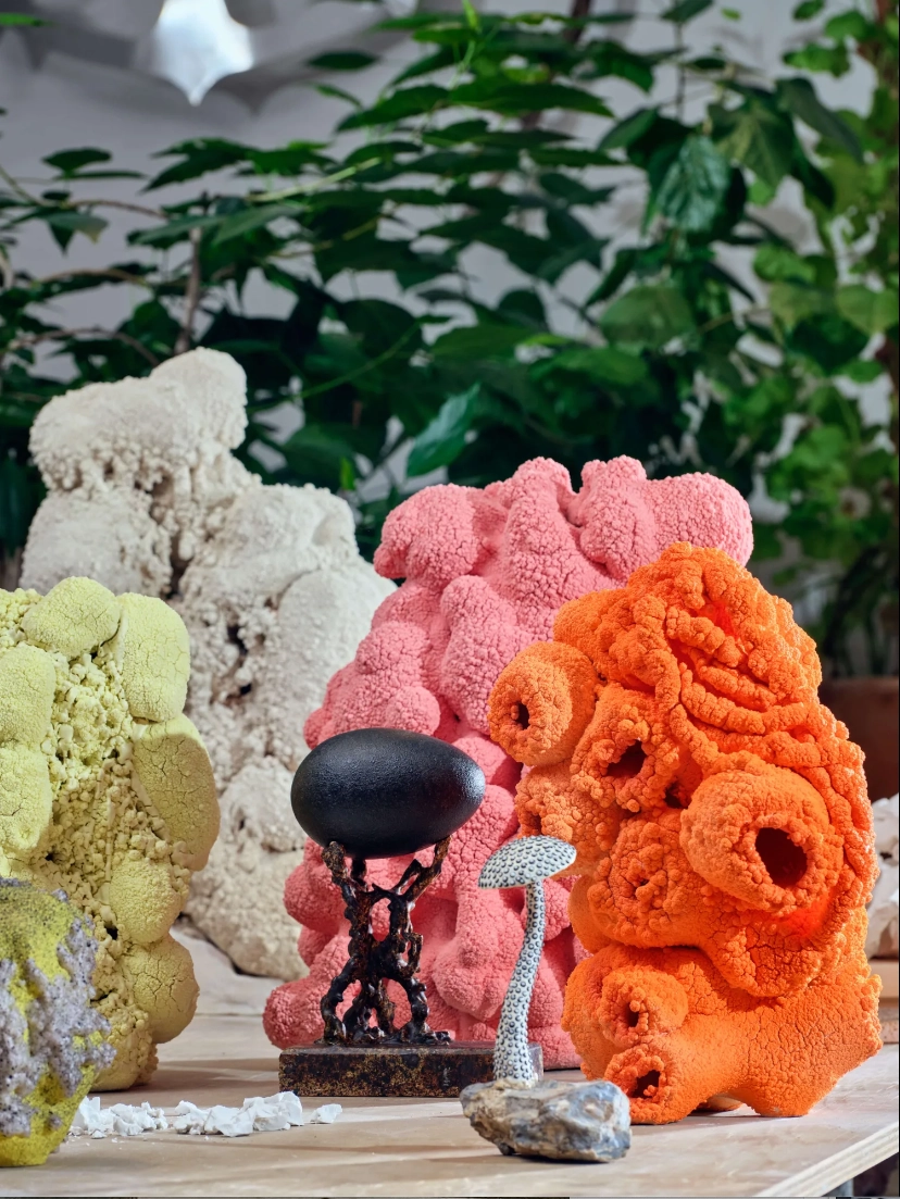 The new works in his solo exhibition – his first in 7 years – have emerged through improvisation and are characterized by Sundberg’s radical way of pushing his material to its extreme limit. Some familiar shapes reappear, such as mushrooms, organically shaped urns, hills and mounds, but also new shapes and objects have been added such as smooth eggs and manically rolled and glazed small balls attached to the sculptures. Together, the works form a hallucinatory landscape, a supernatural and twisted nature where each personal object is a testament to a laborious and time-consuming work with shapes, surfaces, colours and several layers of coloured porcelain. Unlike previous works by Sundberg, no figurines are found here, but the new works instead include an in-depth investigation of artificial colour tones, colour depth and technically virtuoso surface structures.