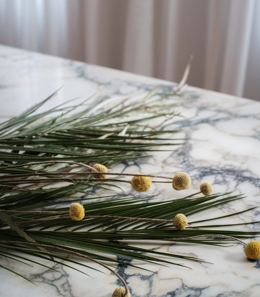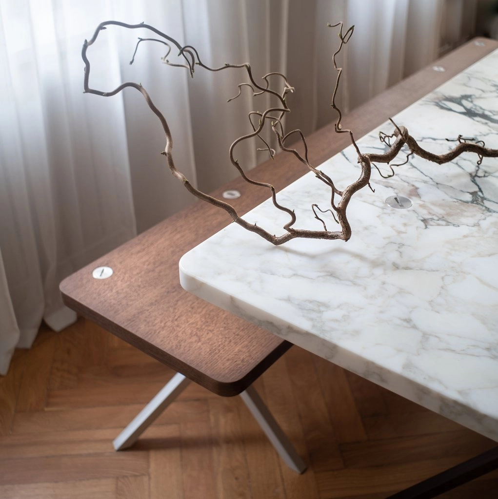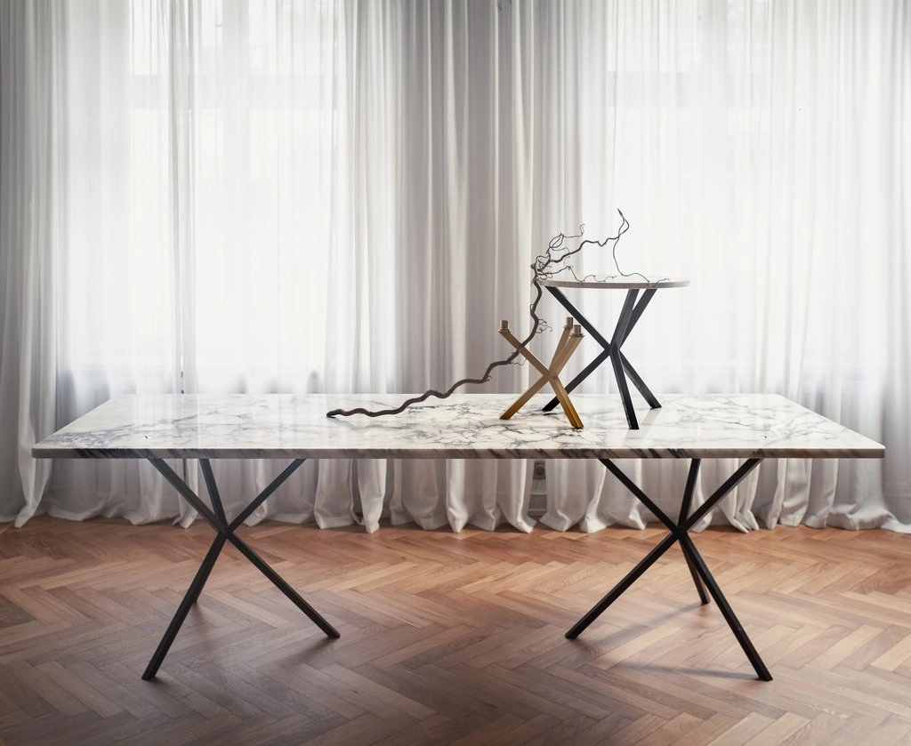 PS Bespoke Dining Table 240×90 cm in Italian Calacatta Arabescato marble with metal cross-legs in chestnut brown that harmonizes with the calacatta marble. Fittings in stainless steel.