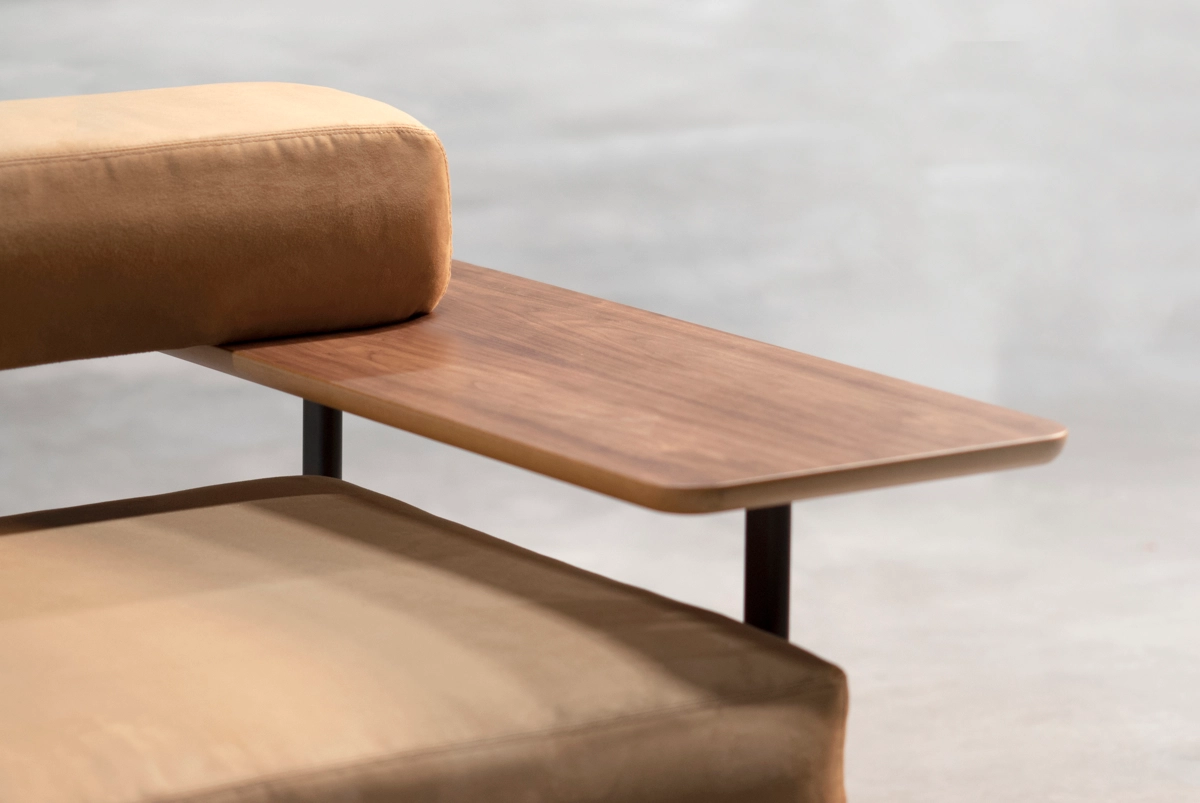 The upholstered elements are held in place by a metal frame, creating an eye-catching combination of varying levels. Plateau is also available without armrests. These can be replaced by a small table that provides a handy surface on which to stand a coffee cup, for example, or perhaps a small computer. Plateau can be used in a variety of settings, such as waiting rooms and receptions, as a seat for several people in an exhibition hall, or at home in the lounge.