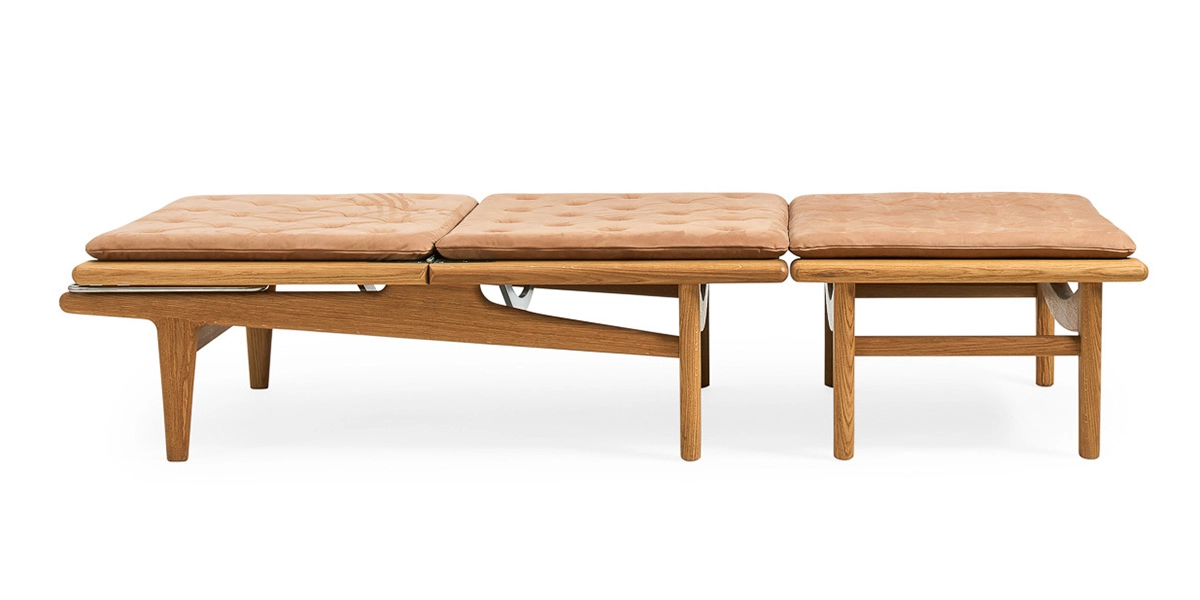 GE1 is available with leather or textile upholstery, and the 54 hand-stitched seams break the surface, adding life to the footrest, to the seat, and to the back. The back is adjustable in positions ranging from zero to 90 degrees, and the sturdy height-adjustable system is a perfect example of how to combine usability, comfort, and style. GE1 can be used as a chair, as a chaise longue, and as a couch – and Wegner’s unique ability to combine wood and steel in an organic design language makes the chair more relevant than ever.