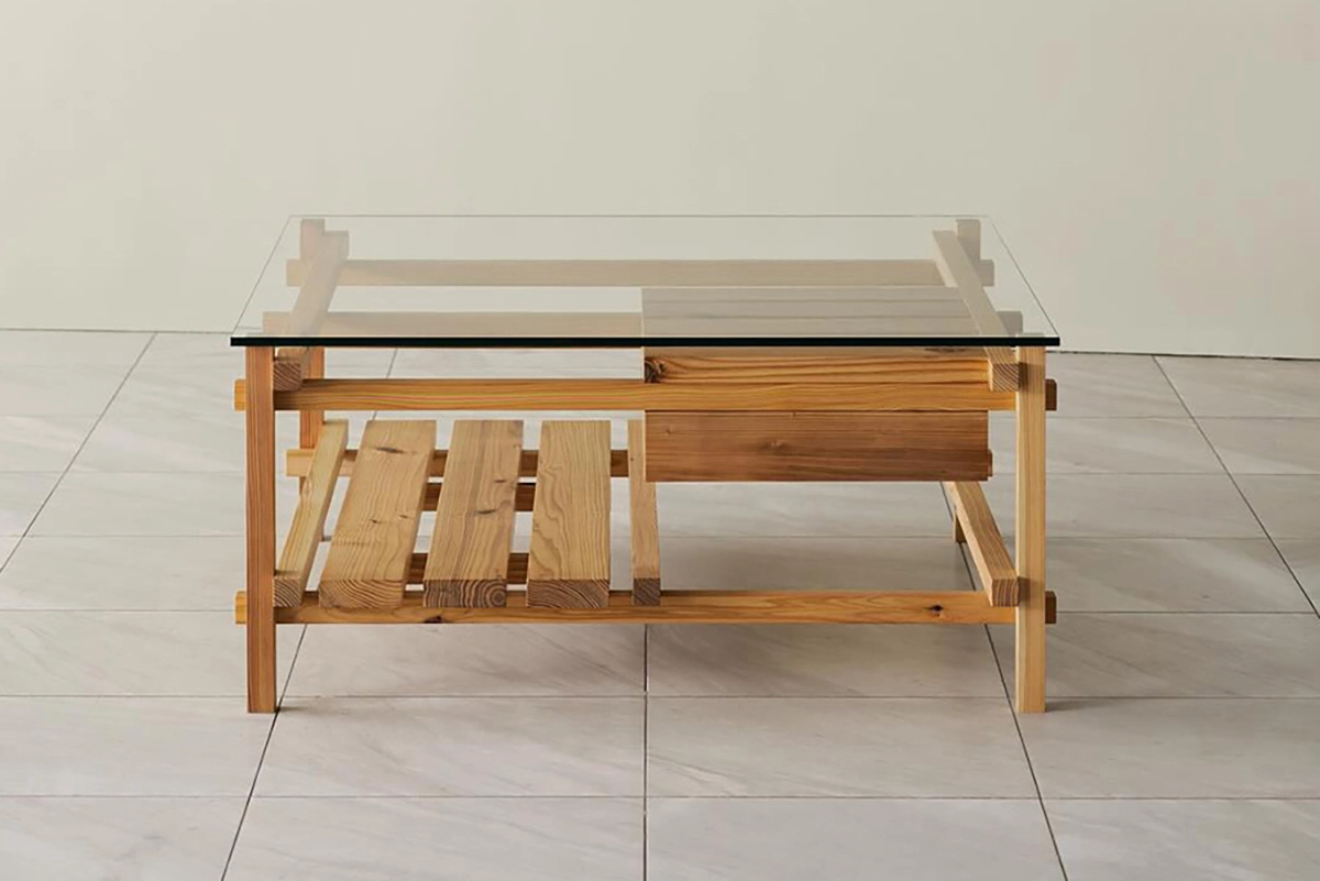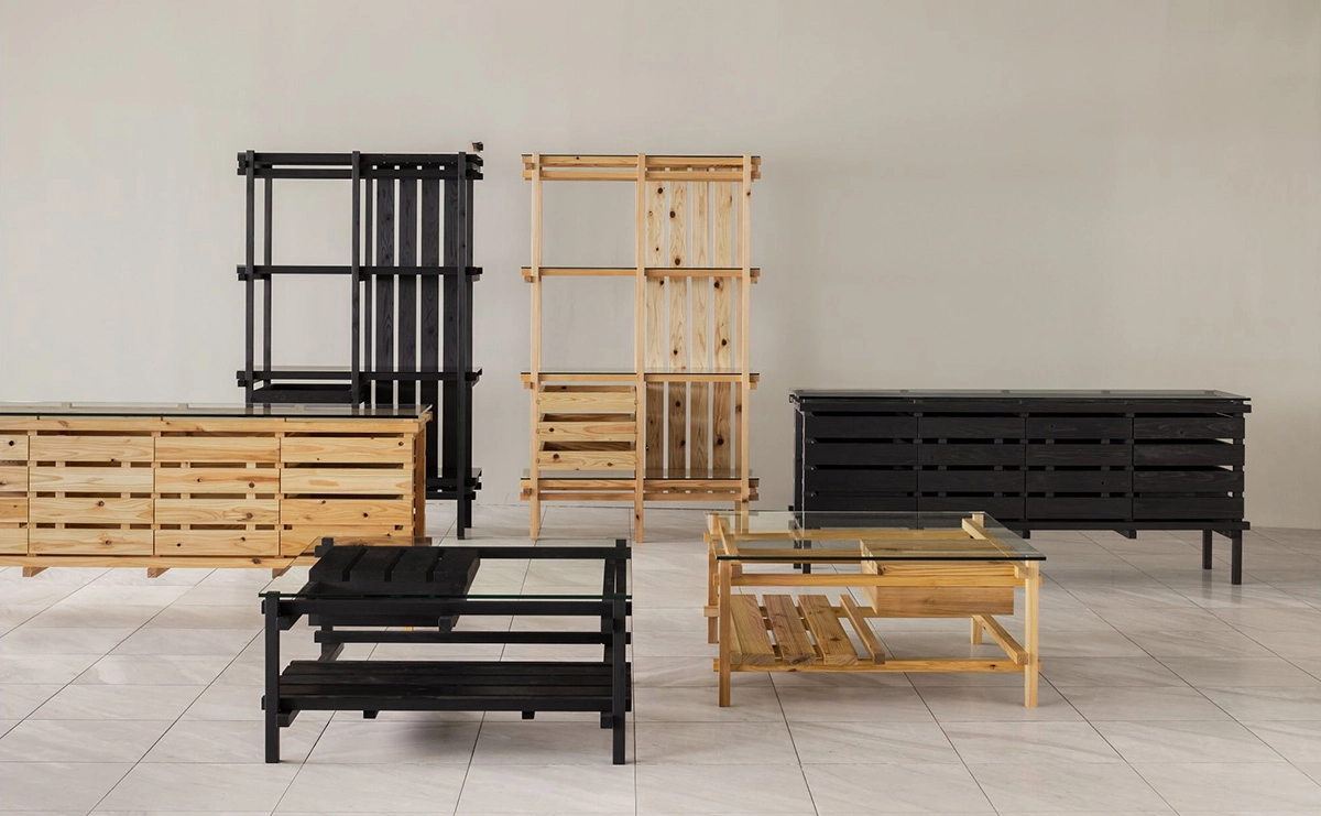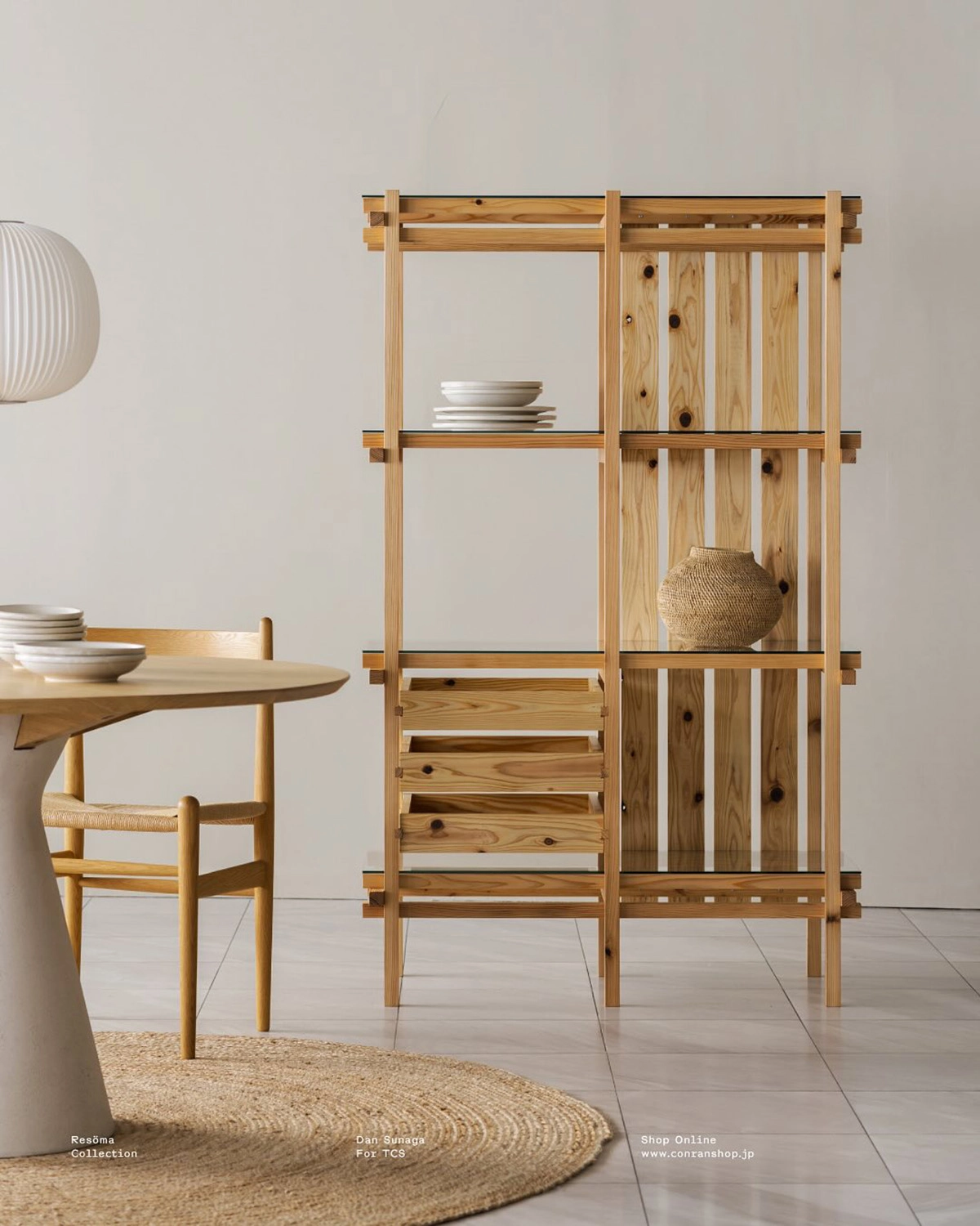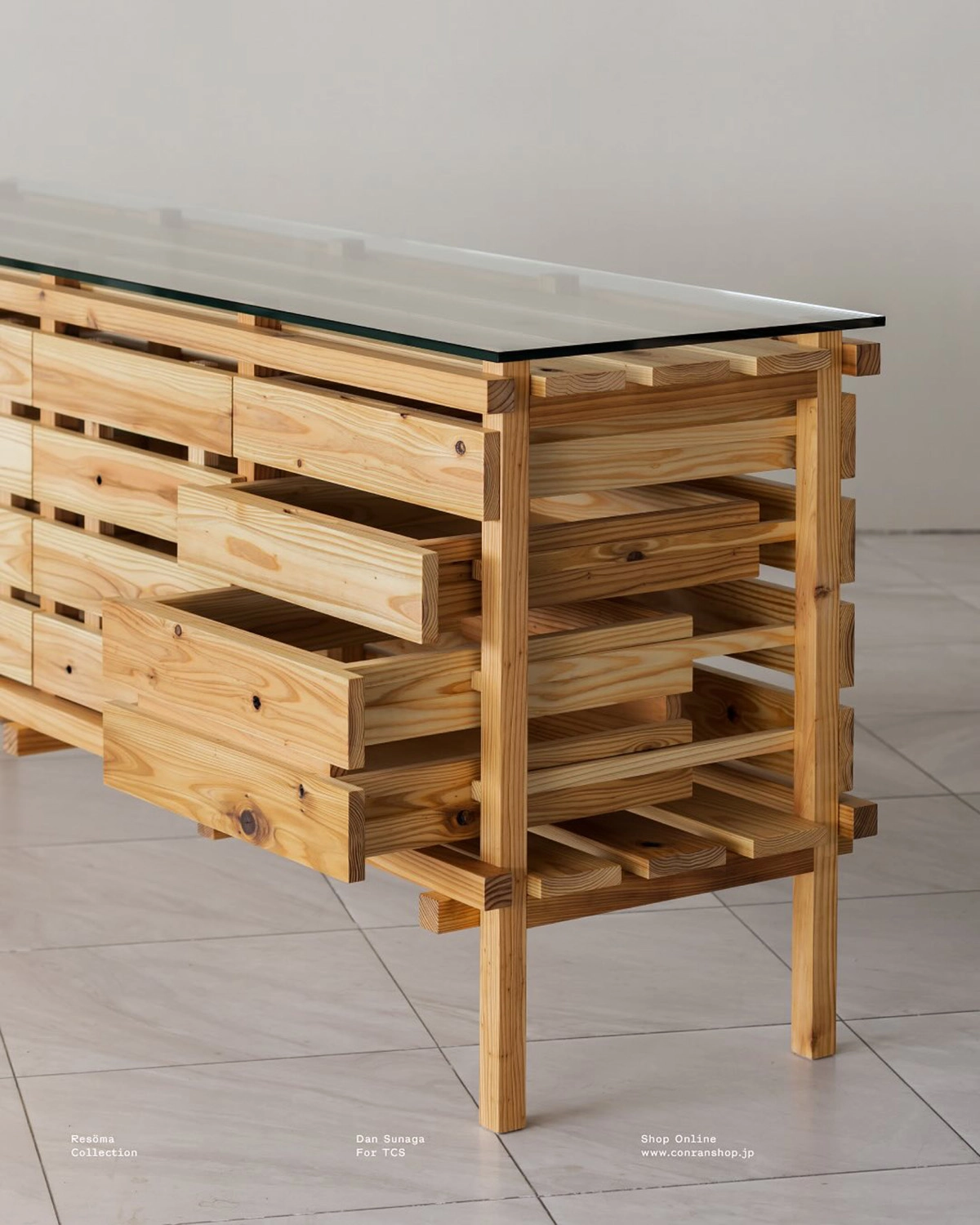 The collection consists of three main pieces, all emphasizing the use of Japanese cedar (sugi) wood, which is unconventional for furniture due to its softwood nature: Resöma Sideboard, Resöma Coffee Table and Resöma Open Shelf.