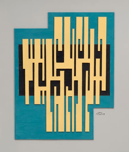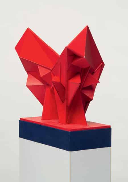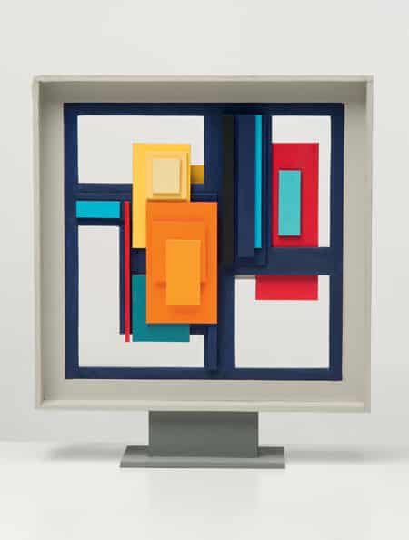 His choice of materials also reflects his experimental, collage-like approach, his favourite materials being cardboard and wood glue. His fondness for cardboard cut-outs endows his work with the geometrical, ‘constructed’ quality of a scale model.