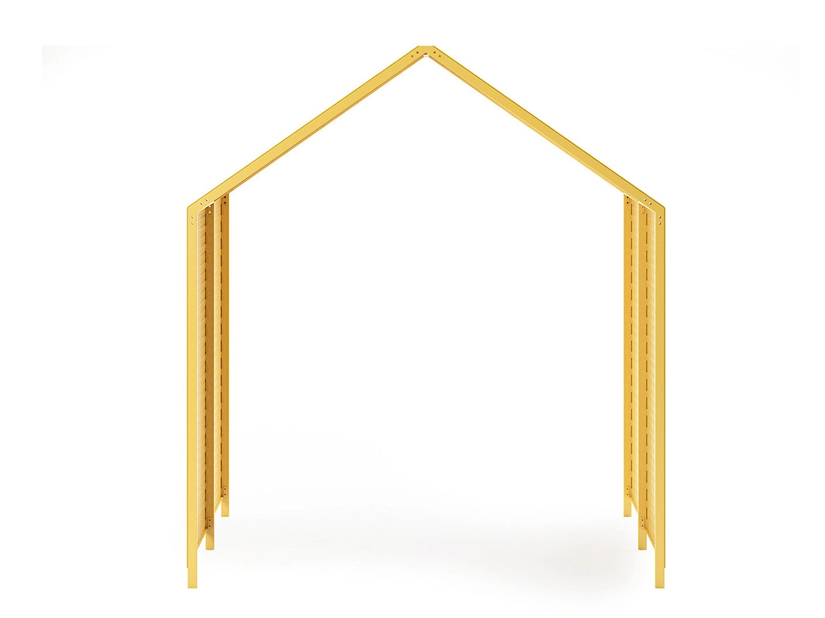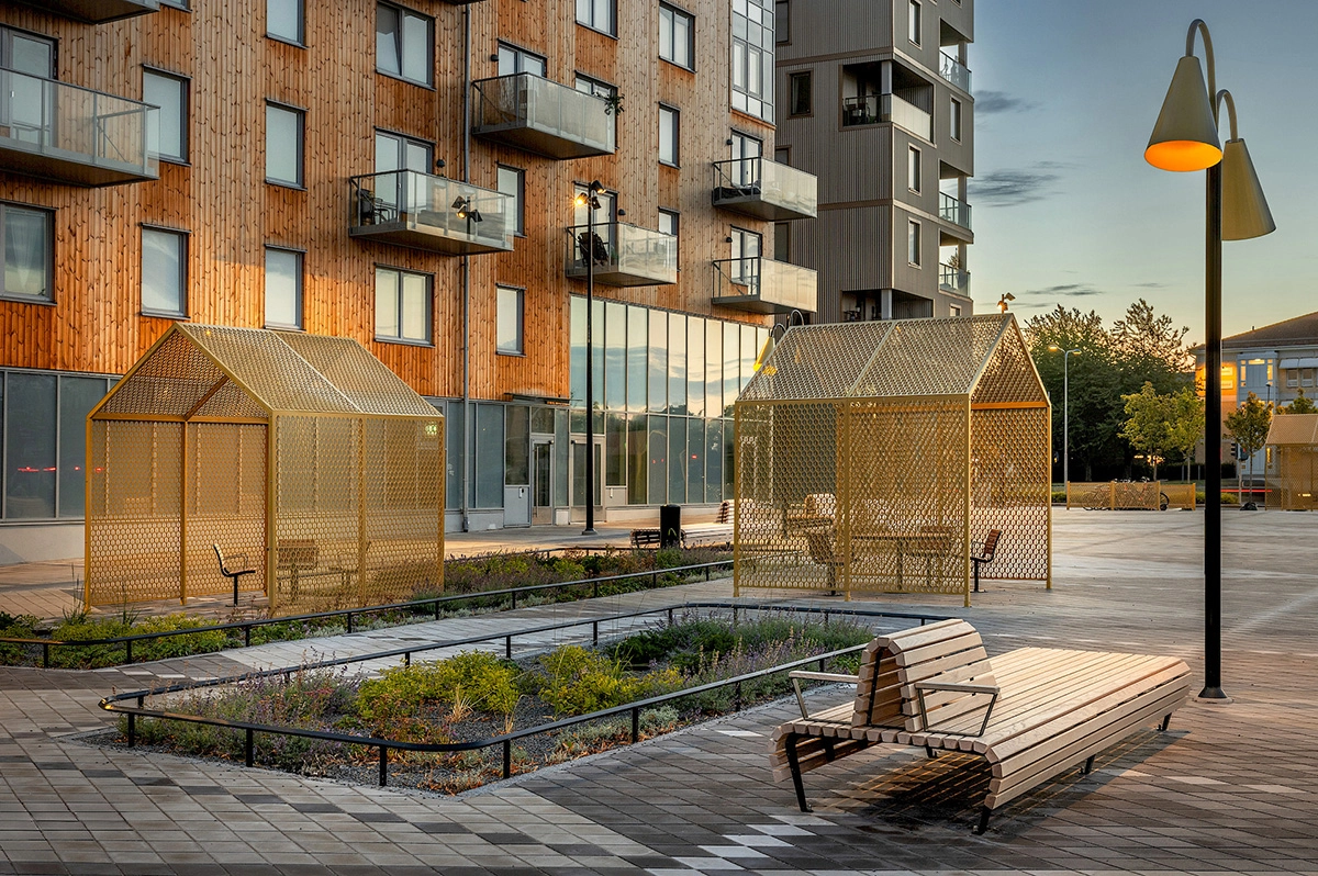 Made of steel, the pavilion is built to withstand weather and wear while offering great freedom in shape and colour. Its archetypal form and perforated pattern are inspired by Swedish Folkhem architecture. A nostalgic aesthetic that pays tribute to the legacy of Anders Diös, the developer whose influence still shapes this part of Uppsala where the idea for the pavilion was first born.