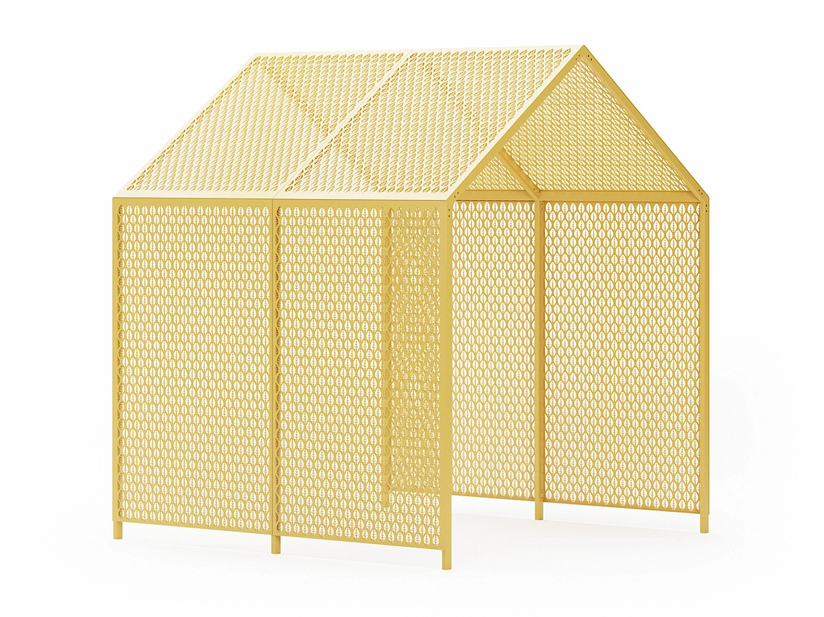 Like an illusion of greenery, the pavilion offers leafy shade through a tactile pattern, perforated into its roof and walls. It provides both shelter and transparency—a place where you feel seen but not exposed.