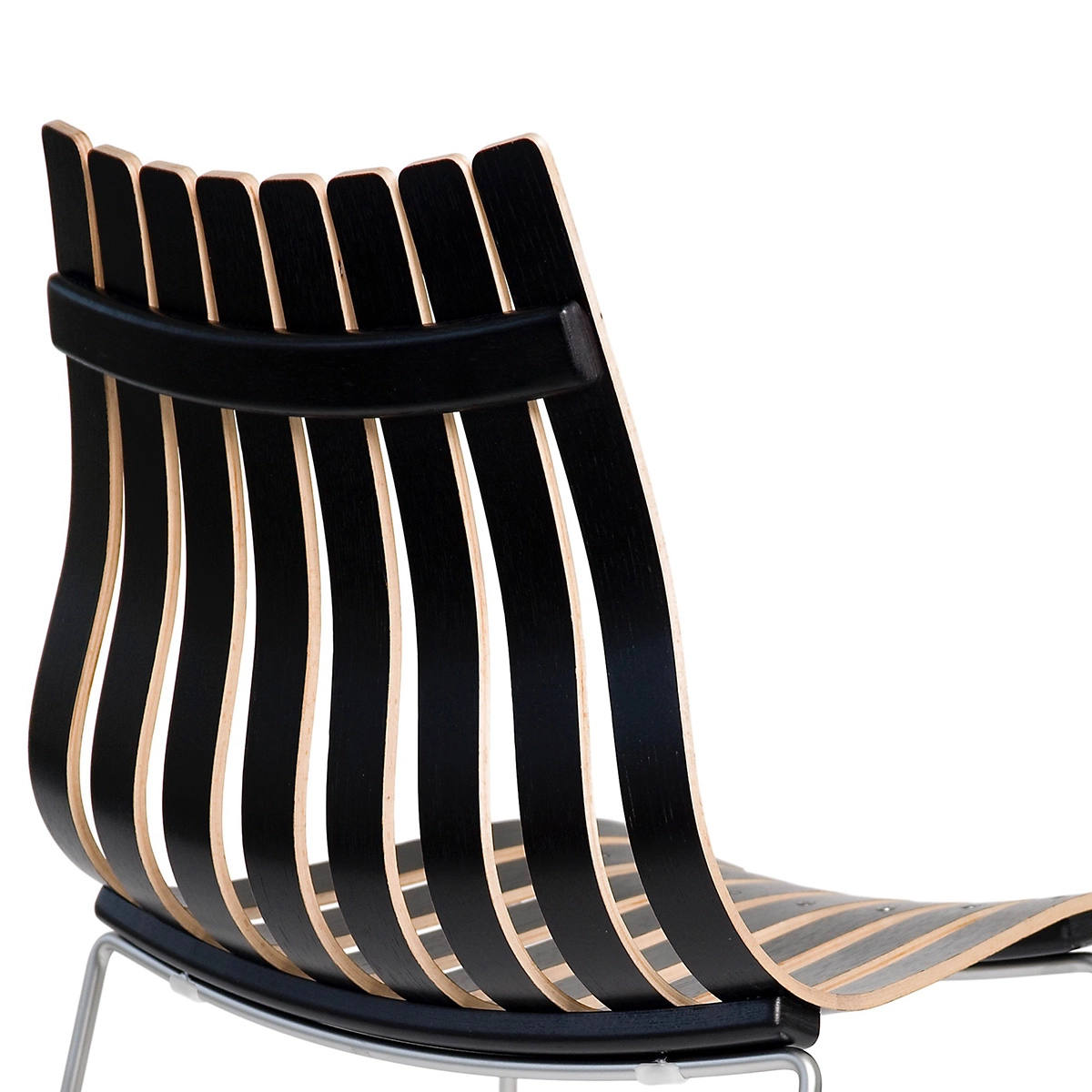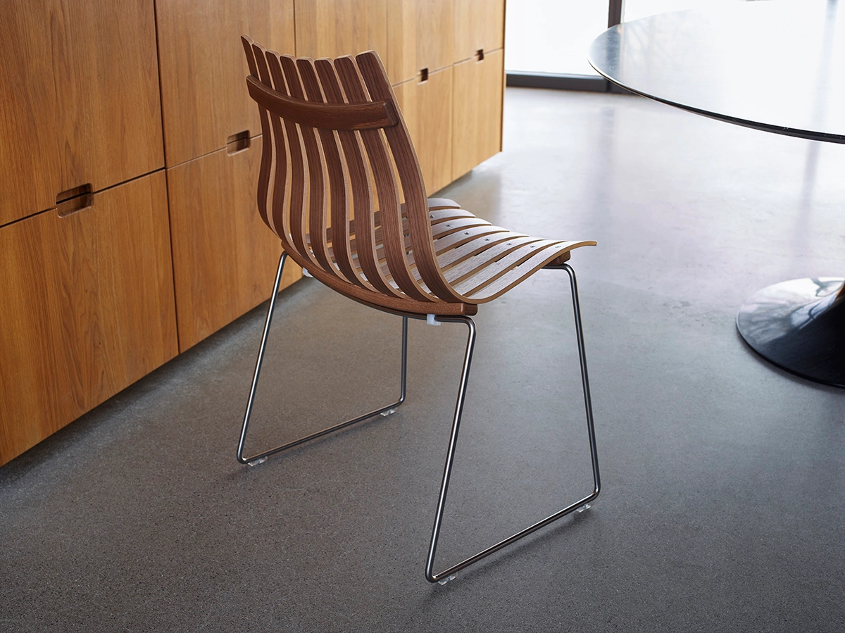 Dining chair in laminated lacquered oak or walnut, fully coloured veneer or with light edges. Satin chrome or black bolt base. Seat cushion and plastic gliders. Design Hans Brattrud, 1957