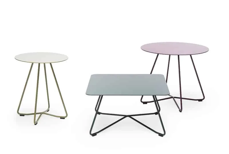 The tables in the range come in two different heights and there are six different table top options. In addition to oak, ash and laminate some of the models are available with a painted metallic table top.