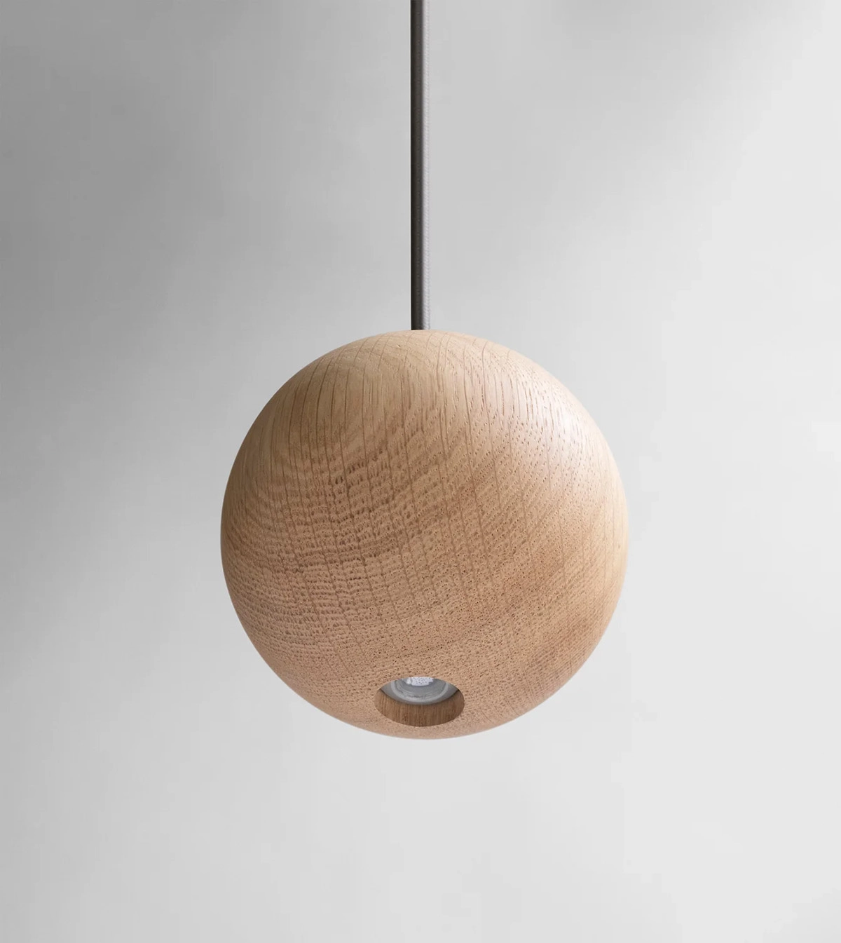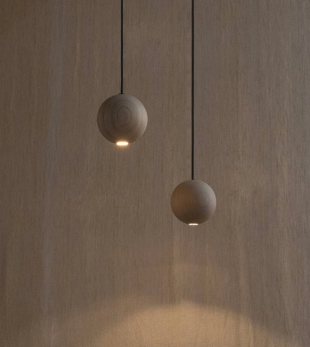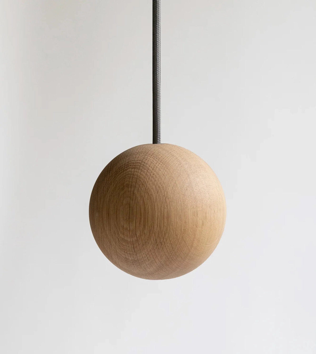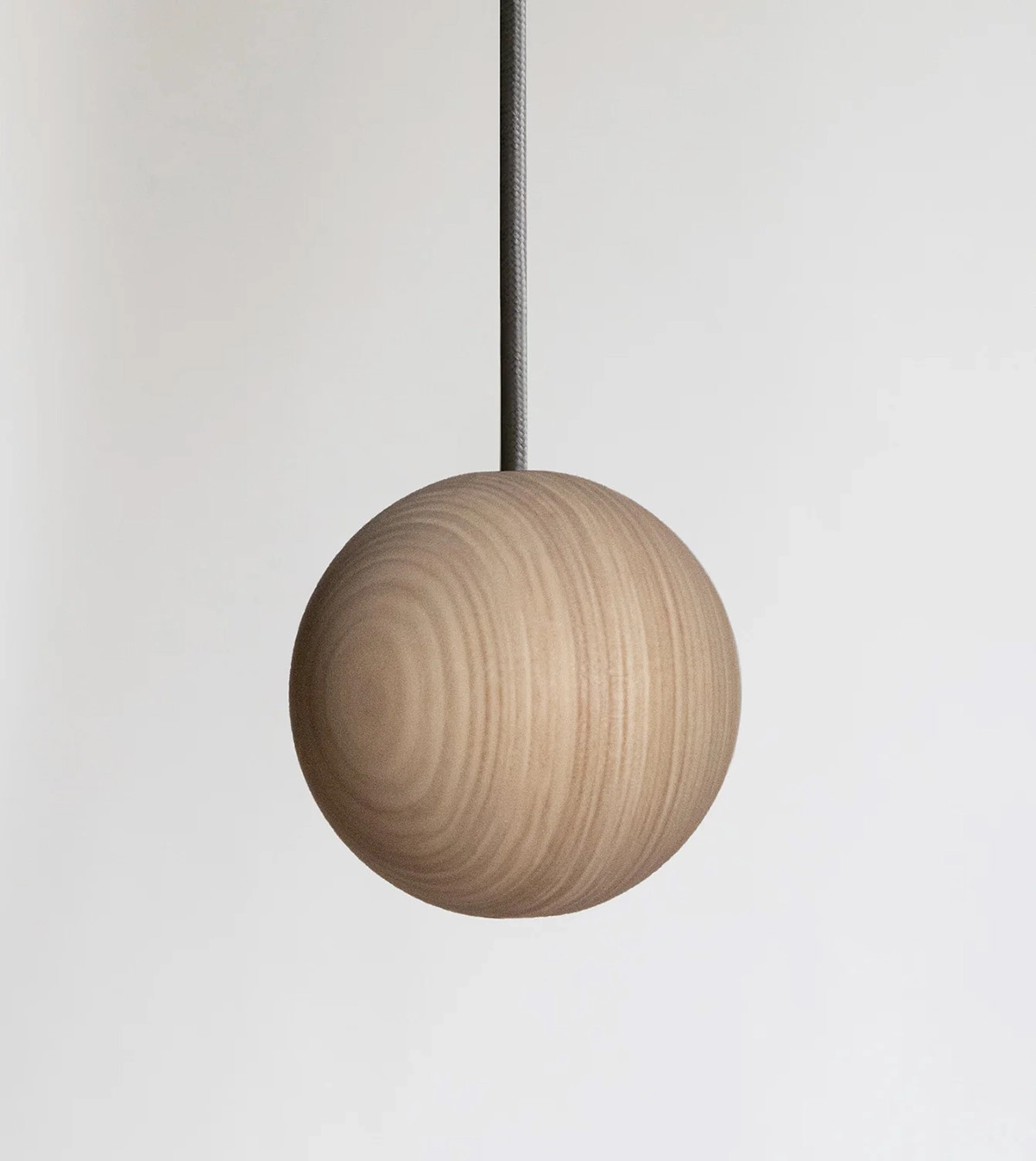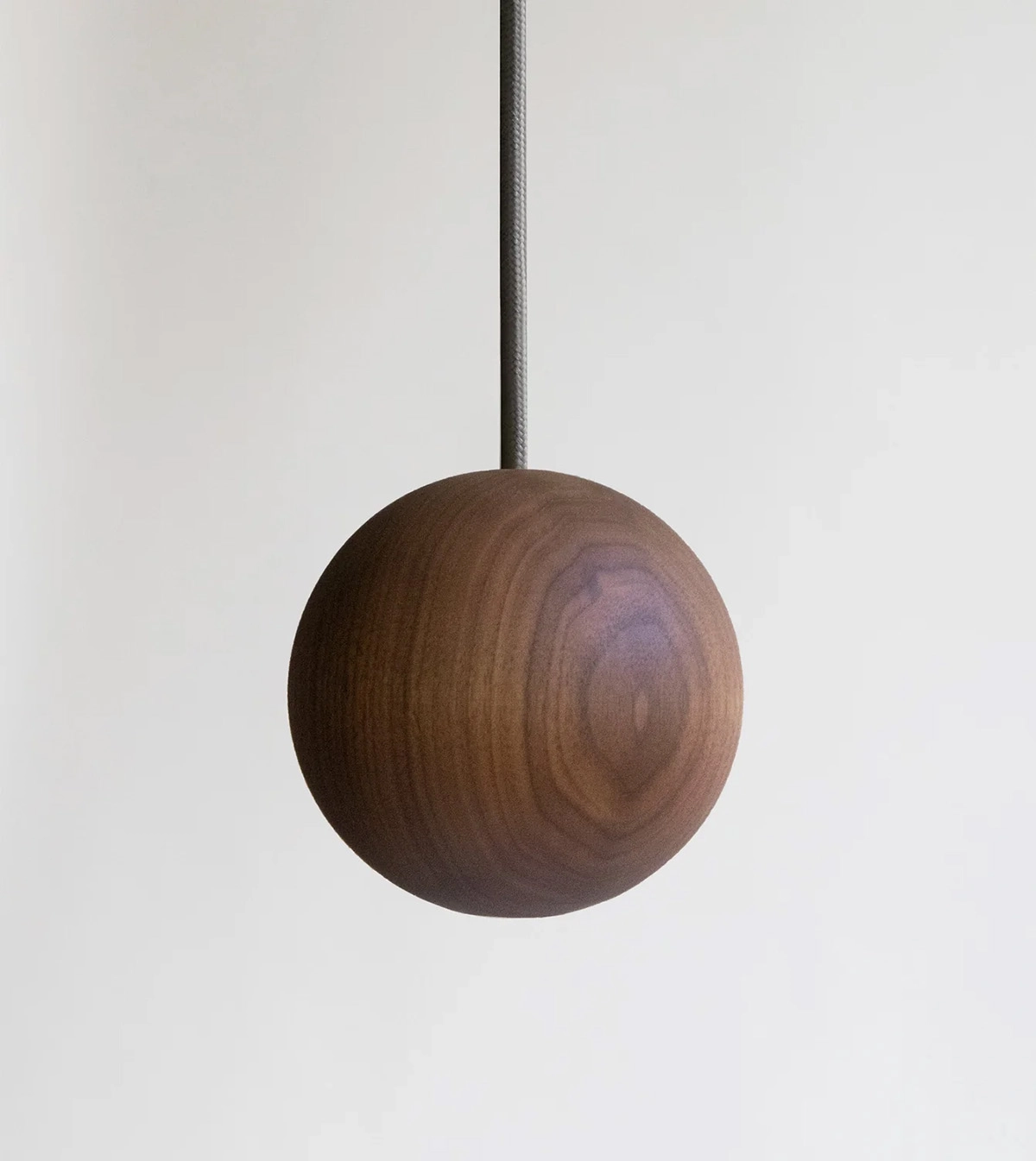 Finnish designer Jenni Roininen applies her Nordic understanding of light and material in the creation of these lustrous pearls of timber. Each piece begins as a dense block, carefully shaped by master craftsman Carlos Barbosa until a perfect sphere is formed. It is then hollowed for its inner void to hold space for light to dwell. The Esfera Lamp’s wood body maintains its material presence, with its natural grain pattern and rich wood tones divulging its species. Casting a focused beam downwards from the base of its globular body, the Esfera Lamp provides intentional illumination whether suspended individually or in a visually arresting array.