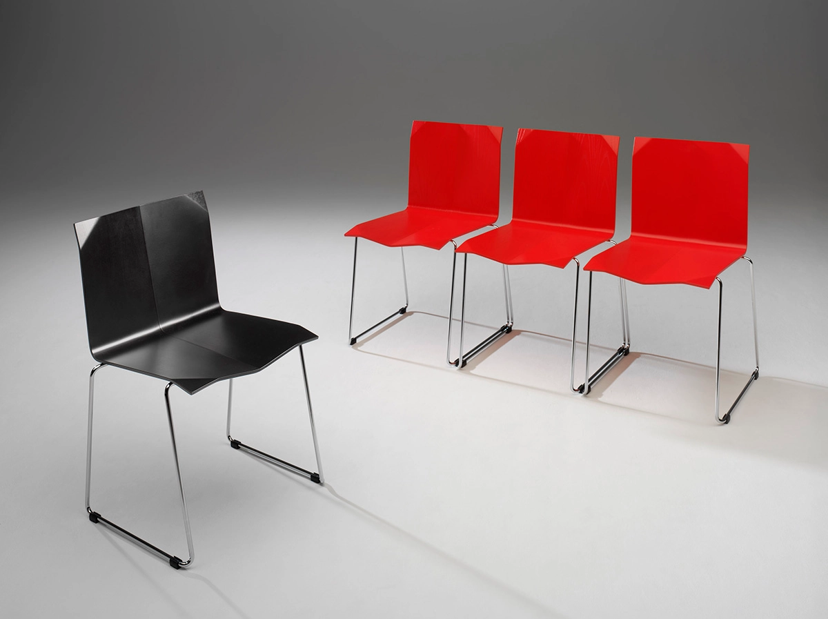 The Origami chair and table by Sigurdur Gústafsson for Källemo (2005) draws inspiration from Japanese paper-folding art. The chair features compression molded birch seating with chrome steel frame, while the table uses the same material approach in 70x70cm dimensions. This collection demonstrates Gústafsson’s ability to translate traditional craft techniques into contemporary furniture manufacturing, creating pieces that capture the geometric precision and elegant simplicity of origami through industrial materials and processes.