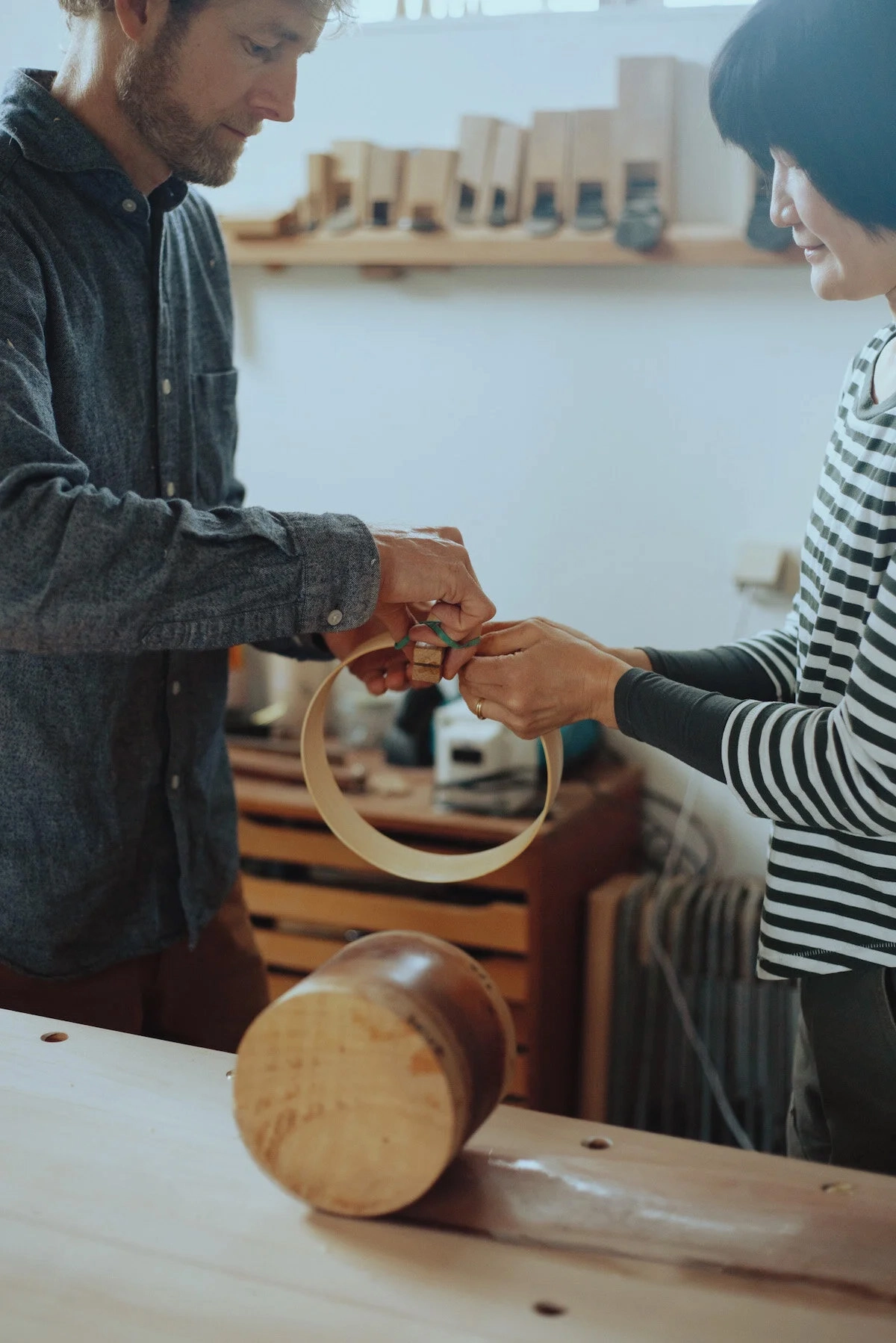 Ken’s interest in woodwork has come naturally as his parents were in furniture manufacturing business. He has furthered his craftsmanship at PP Møbler – a high quality workshop where many of Hans J Wegner furniture is made. Taking a perfectionist approach, he has studied further on lengthy training periods at Japanese carpenter masters. Ken likes to challenge himself as well as the wood to make very delicate products. Examples of such are lathe turned lampshades so thinly they become semi-transparent, another are baskets of pressed veneer sewn with cane cord.