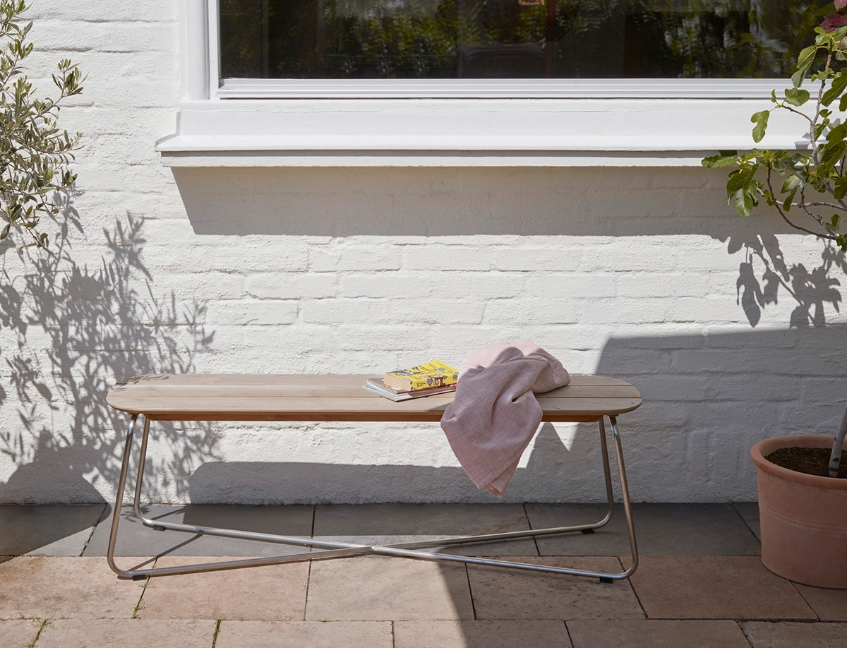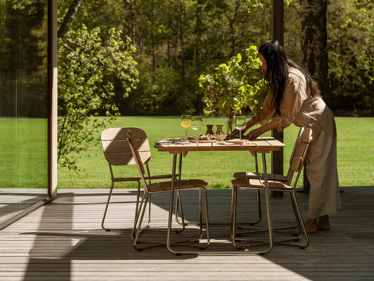 The Lilium collection is a contemporary take on outdoor furniture that also sits wonderfully indoors. Designed by renowned BIG – Bjarke Ingels Group – Lilium is long-lasting furniture perfect for outdoor events and gatherings. The Lilium Lounge Chair offers a laid-back break, where the backrest gives slightly when you sit down. The seat and backrest are made of 100% FSC-certified teak and front-mounted which creates a sleek back without any visible screws. The slender frame is strong, yet light, crafted in stainless steel, ideal for relaxing outdoors on sunny days.