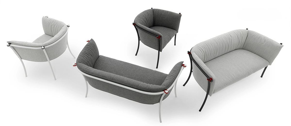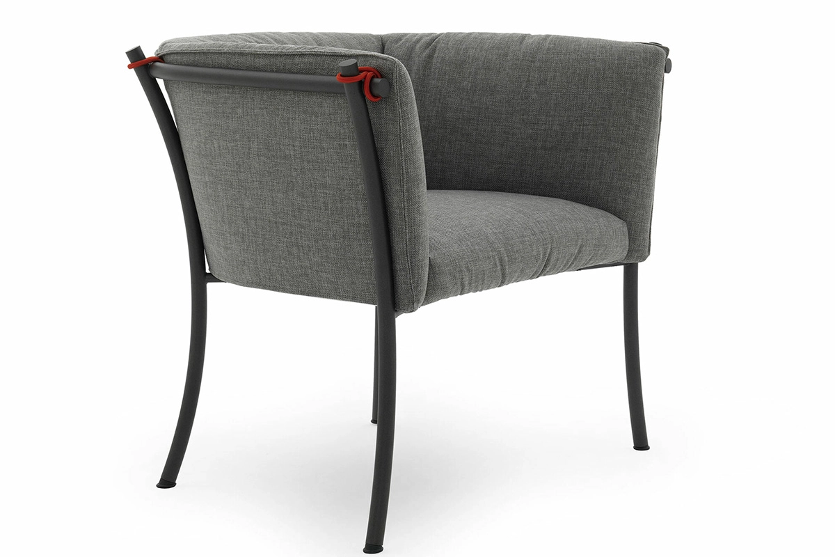 Smeralda, the armchair and small two-seat sofa designed by Anna von Schewen, comes from the desire to create a visually light, contemporary seat that would be extremely comfortable at the same time. The structure in gently curved steel is based on the typology of ancient Greek chairs, combined with that of seats made with willow, where the bent branches create soft, continuous curves. The internal padding has been developed for outdoor use.