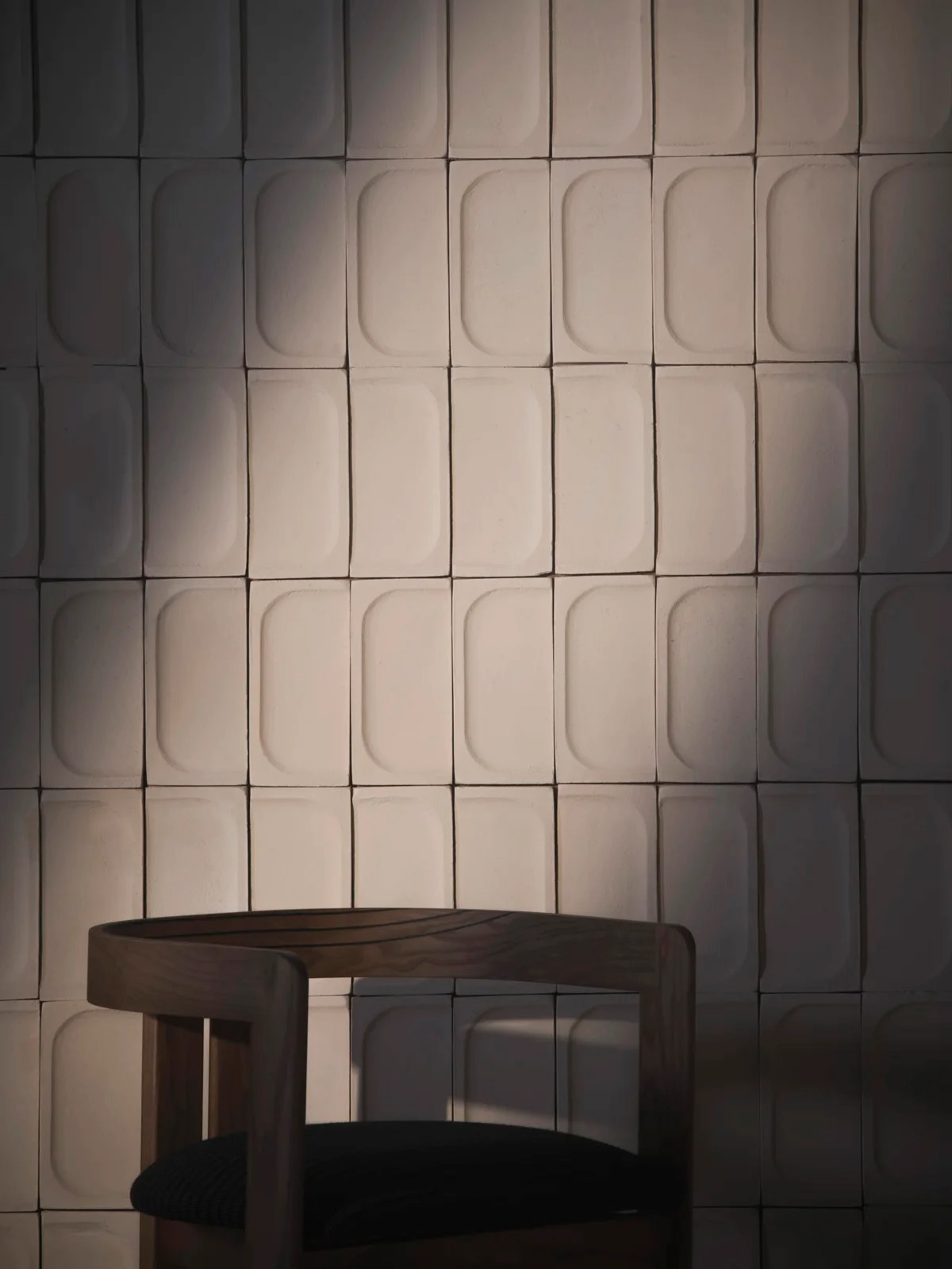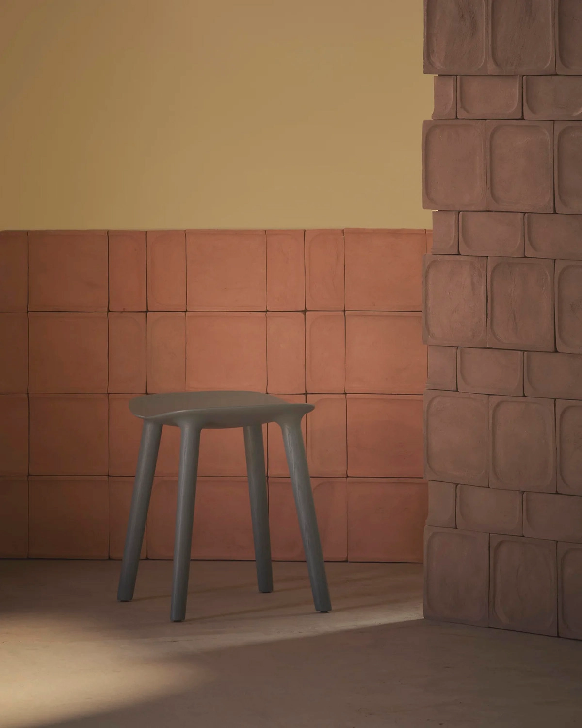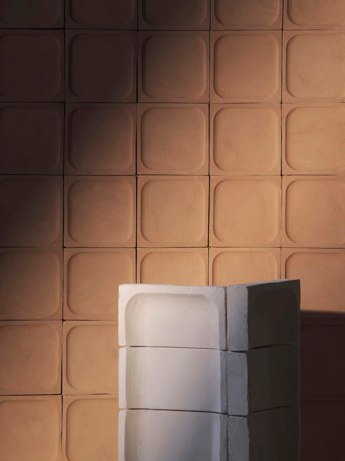 The soft forms and shapes resulting from the reduced material enhance light, shadow, and texture and bring out the uniqueness of the traditionally crafted tiles, integrating the imperfections and roughness of the material as part of the expression.