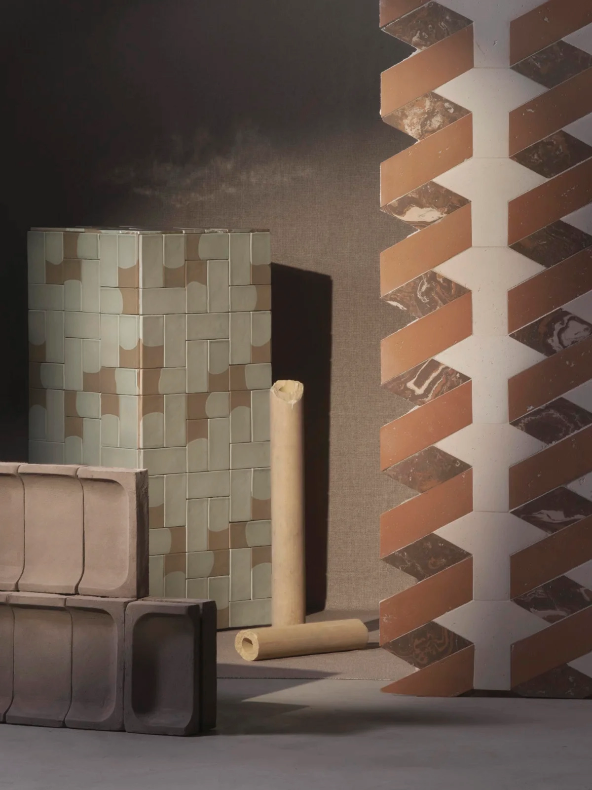The collection consists of a wall tile system and 3D elements. The two variants of the 3D component are larger and thicker than the tiles and can be used similarly to bricks to create walls or support surfaces both inside and outdoors.