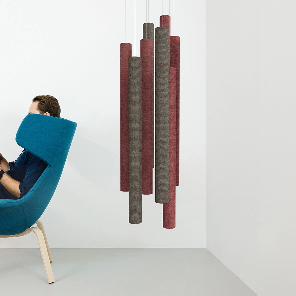 Soundsticks® was launched in early 2019 after two years of development in collaboration with designer Andrea Ruggiero. Made of textile scraps molded into the shape of a tube, Soundsticks® are covered with left-over textile from production and held together at the ends by recycled aluminum caps. This unique product can be hung from rails in a linear or radial pattern depending on need and space.