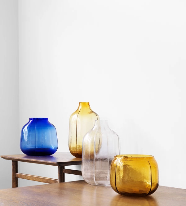 The series consists of a tall vase in brown or clear glass, a mid-sized version in steel blue and a smaller edition in brown. The neck of the vase gets longer with each model, giving each size its own character and making them all suited to different kinds of flowers and bouquets.