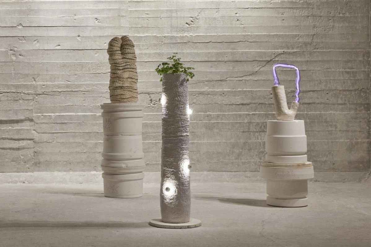 The exhibition “PUSH-UPS – Goal-oriented exercises + Ifö Center” presents ceramic works by Attua Aparicio created during her residency at Ifö Center, a cultural center in Bromölla, Sweden. Aparicio has used targeted exercises to extend the limits of both materials and techniques. Coils of clay filled with glass and light strive upwards, creating a combination of sculpture and function.