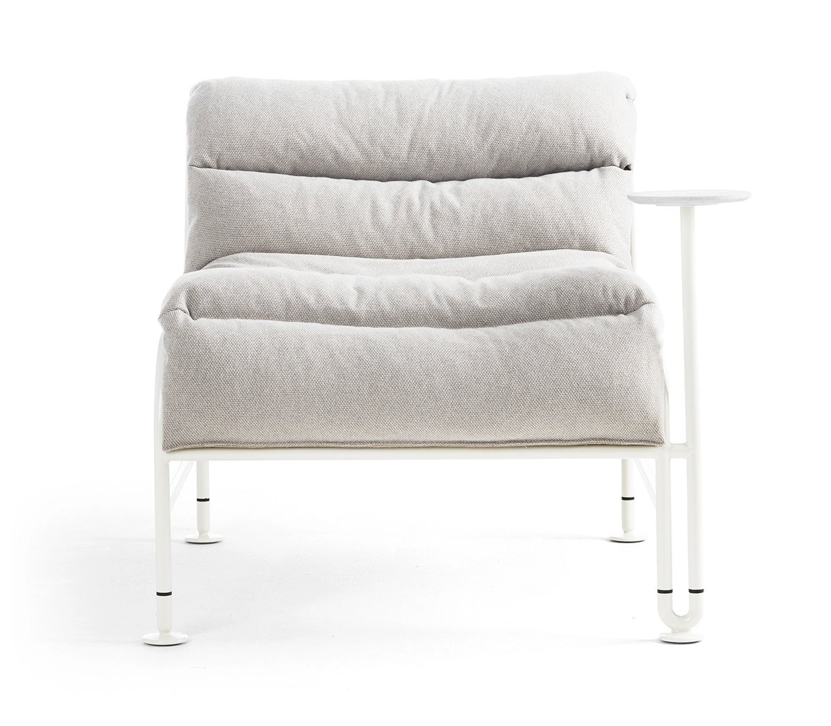 The side table underscores an essential detail that is key to the Sunny concept: a u-shaped foot that, in this case, connects the table’s single leg to the seat’s leg frame. This ingenious feature allows functions to be added and seat modules to be combined to create larger furniture pieces and shapes for different types of rooms and ways of using space.