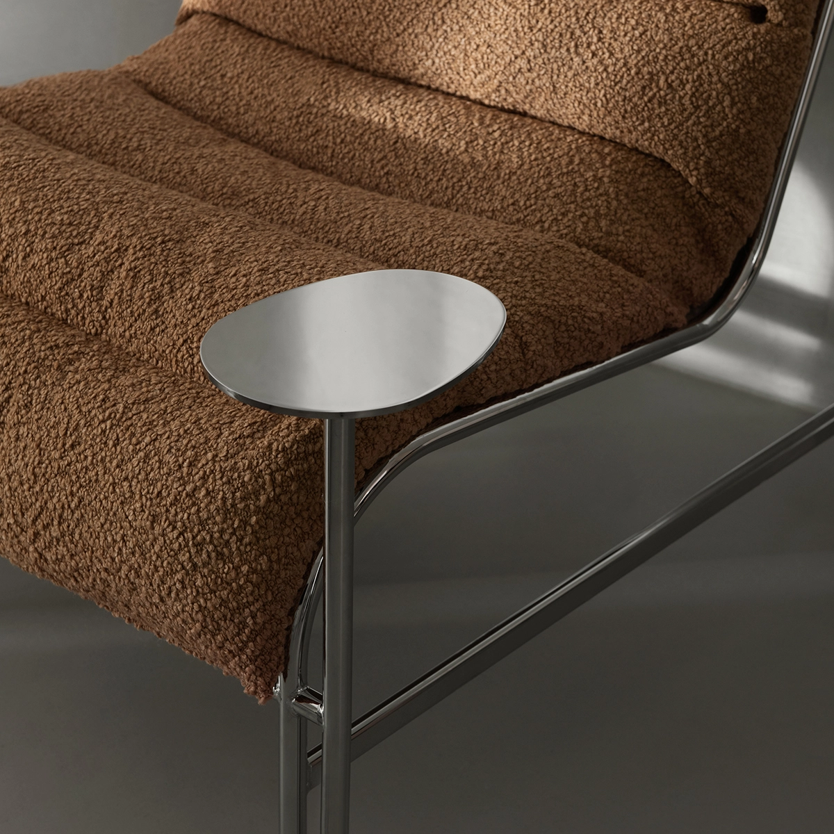 This year, the designers have complemented Sunny with an oval-shaped metal side table for one’s coffee cup or laptop. “We got the idea from the shape of puddles and ice patches,” explains Allard. “The chromed version gives the impression of a mirrored sheet of water. There’s also a version of the table made of recycled plastic.”