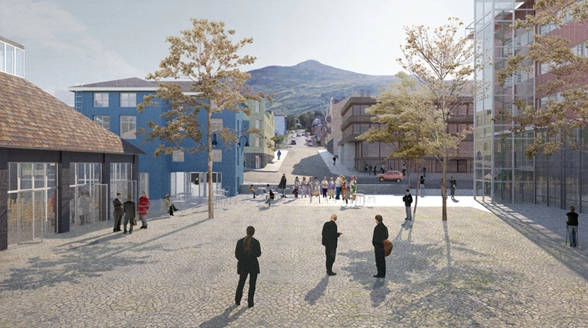 There are three types of public spaces showing each their own urban form, in which the architectural reference to the material qualities of the city plays a major role. A very beautiful idea of this project is the open a public space with view to the mountain Fagernesfjellet, giving the urban space a transversal axis. This space introduces a previously missing link that connects the core of the city better with the adjacent residential areas and the higher lying university buildings.