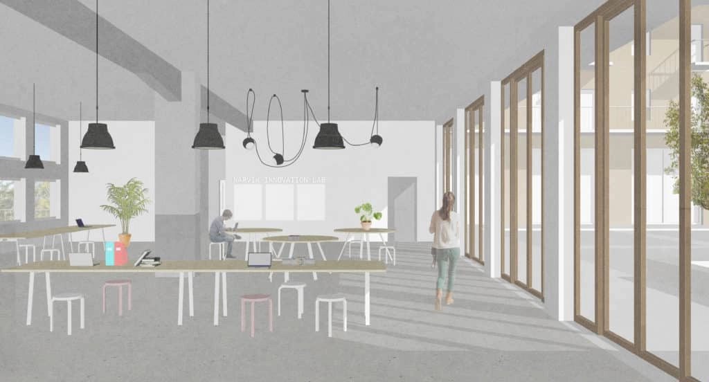 Regarding the new purposes, the architects have analysed in detail the potential of the existing buildings. They are making convincing propositions for each of them and are carefully adding two corresponding buildings that forms a new gate to the park. This successive approach – with its respect for the existing building structures –is challenging the balance of how much to design or let the design become the result of the activities at the place. The award winner succeeds here on two levels. On the one hand, even if the architecture is considerate, it integrates outstanding new qualities such as the large lounge overlooking the city in the new building which is called Unité. On the other hand, the proposed new exhibition and learning center, which are using the existing garage architecture, is especially convincing as it incorporates a contemporary image of multi-purpose co-working spaces in the fabric of the city. In doing so, the architects apply references from existing conversions that correspond very well with the requirements of the city of Narvik for a constantly evolving mix of uses.