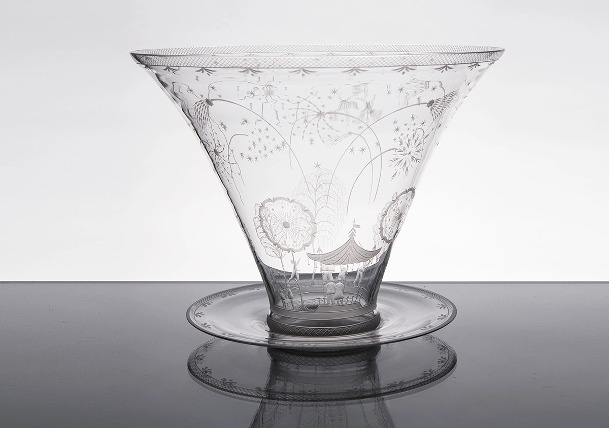 NMK 37/1923, Orrefors glasbruk, Edward Hald, “Fyrverkeriskålen”, Formg. 1921, Glas, graverad dekor