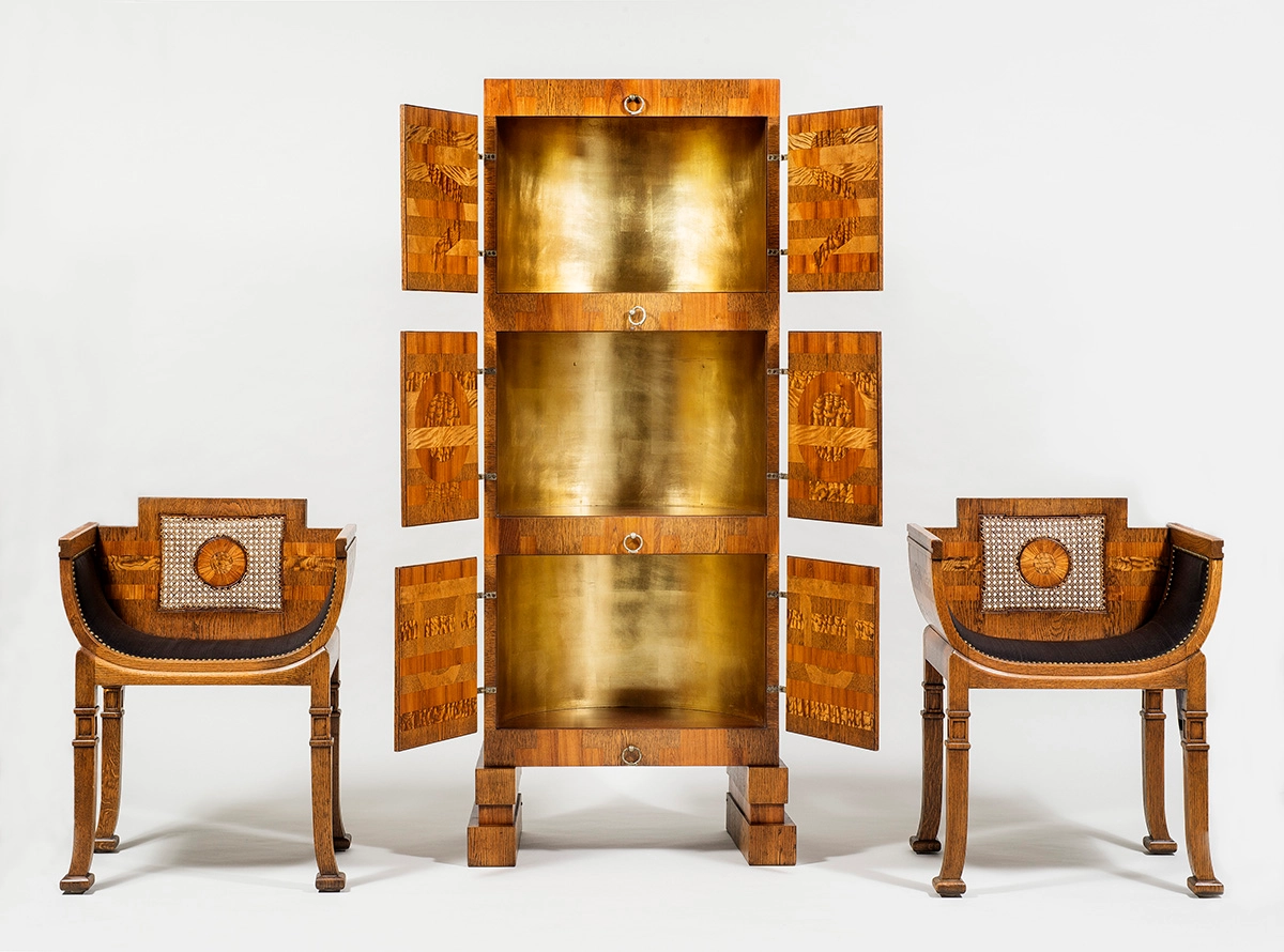 NMK 91/2015, Nordiska Kompaniets verkstäder, Carl Hörvik, Skåp, Utf. 1925, Fanerat, delvis massiv ek, rosenträ, ungersk ask och björk, förgyllt, förtent smidesjärn
