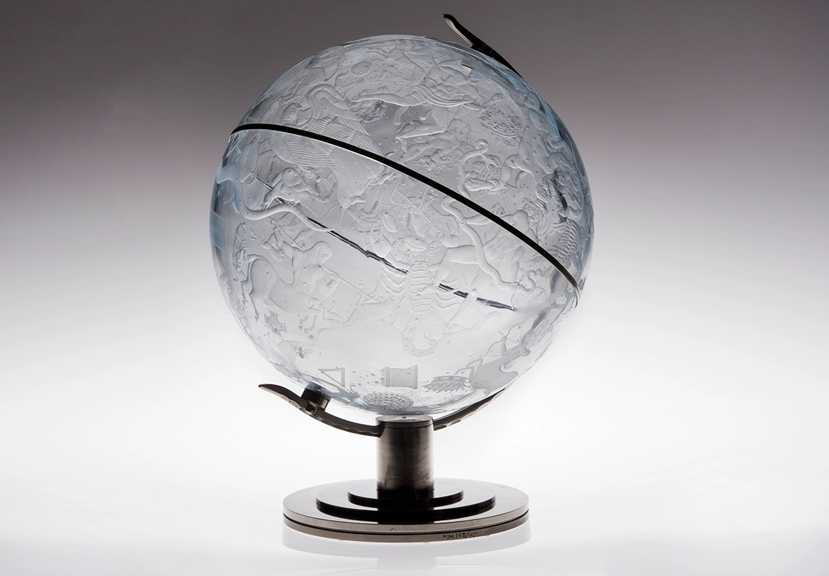 NMK 142A/1930, Orrefors glasbruk, Edward Hald, “Himmelsglob”, Tillv. 1929 – 1930, Graverat kristallglas med ställning av tenn