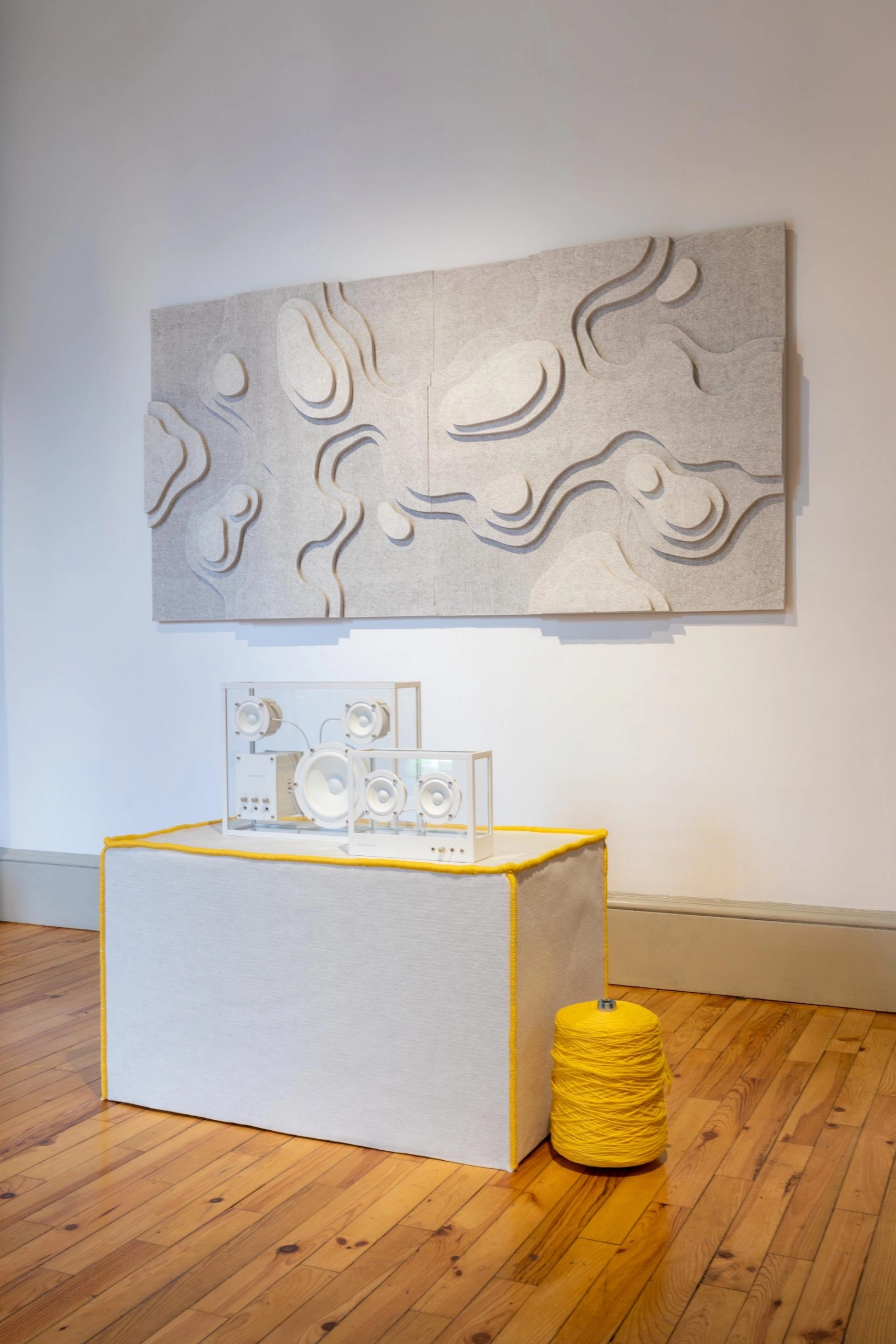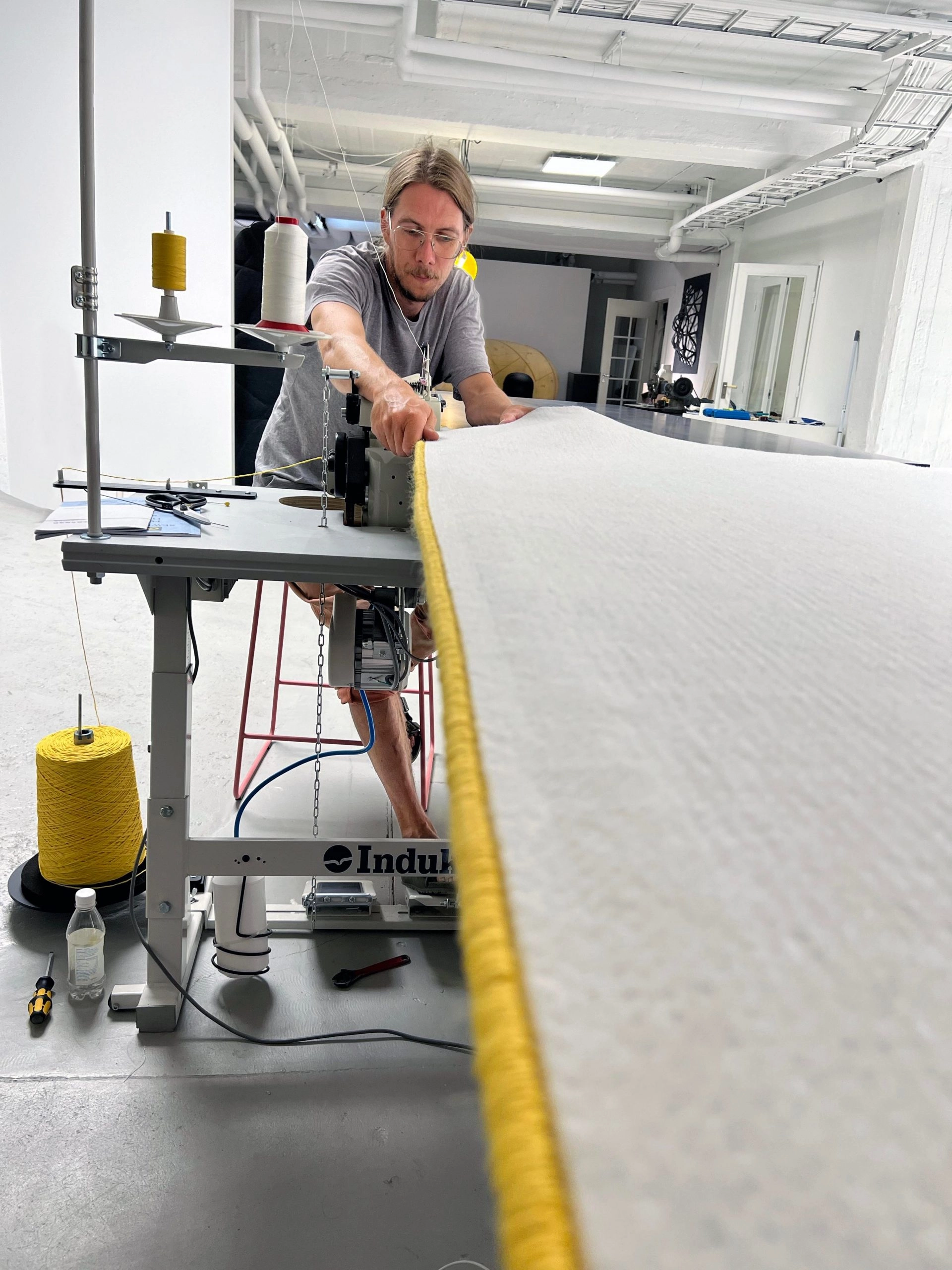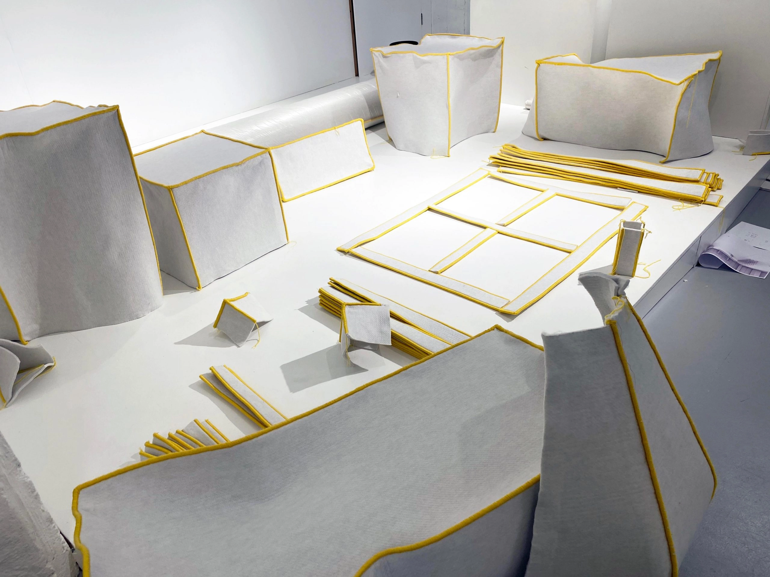 For the showroom, we created a three-dimensional sketch of the room and objects. The white felt fabric serves as a blank canvas, and the yellow stitches represent strokes made by a pen. Together, they create a vivid backdrop for the exhibits. In dialogue with the participants, we set out each exhibitors their own space. At the same time, we formed a unifying color scheme overall. It represent the magical properties of the sunlight of the Swedish skies and the yellow tones of the facades lining the streets of Stockholm. We produced all of the scenography by hand in our studio.