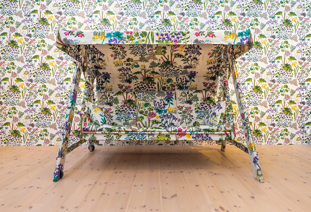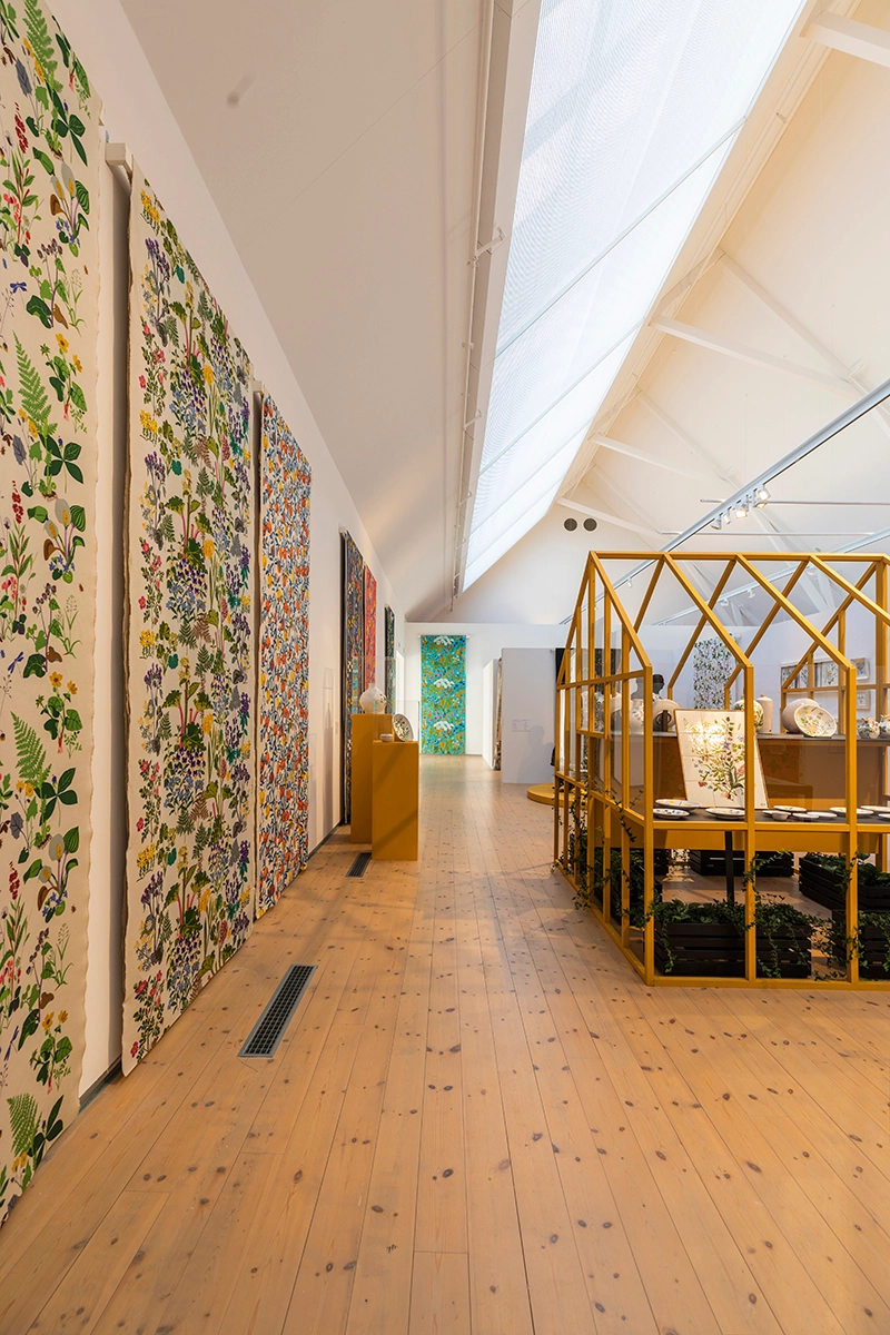 The sisters Lisbet Jobs (1909–61) and Gocken Jobs (1914–95) created ceramics and patterns for textiles that still make their homes flourish. The Swedish flora winds over barrels, tiles and hand-printed fabrics. Sirlow meadow flowers, delicate foliage and ripe berries show the beauty of the unassuming.