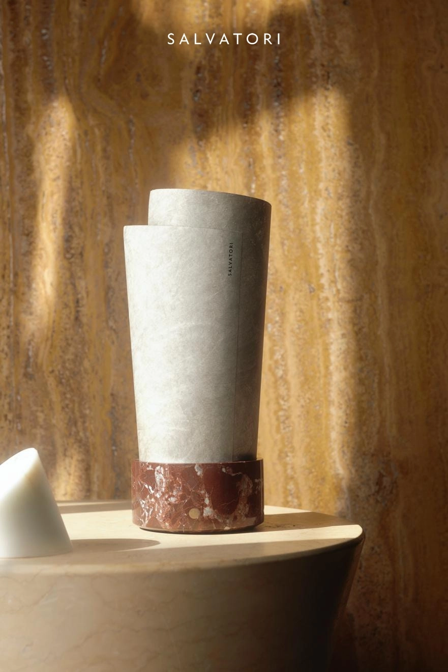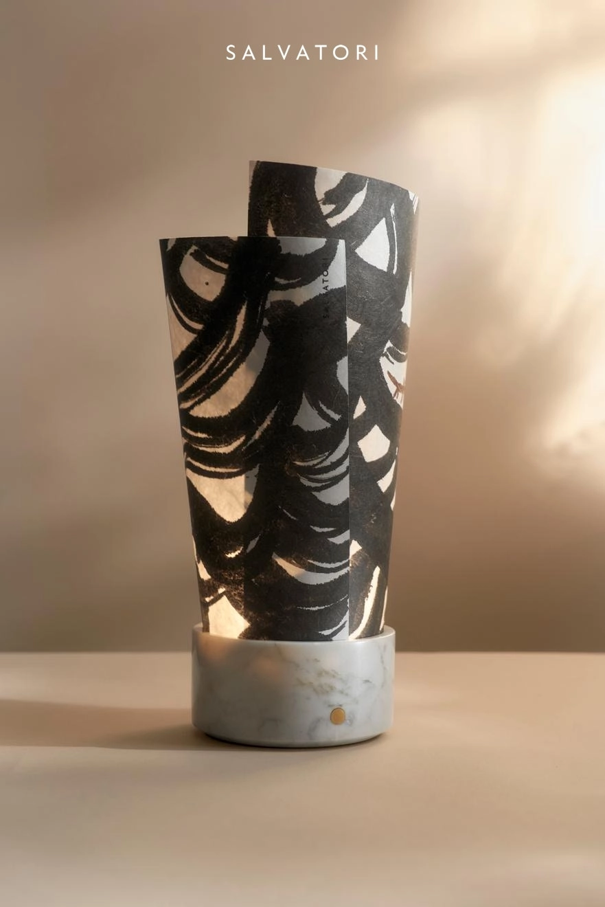 The Teo table lamp, designed by Luca Nichetto, is a customisable accessory comprising a marble base that holds a sheet of lightweight yet hardwearing, breathable paper.