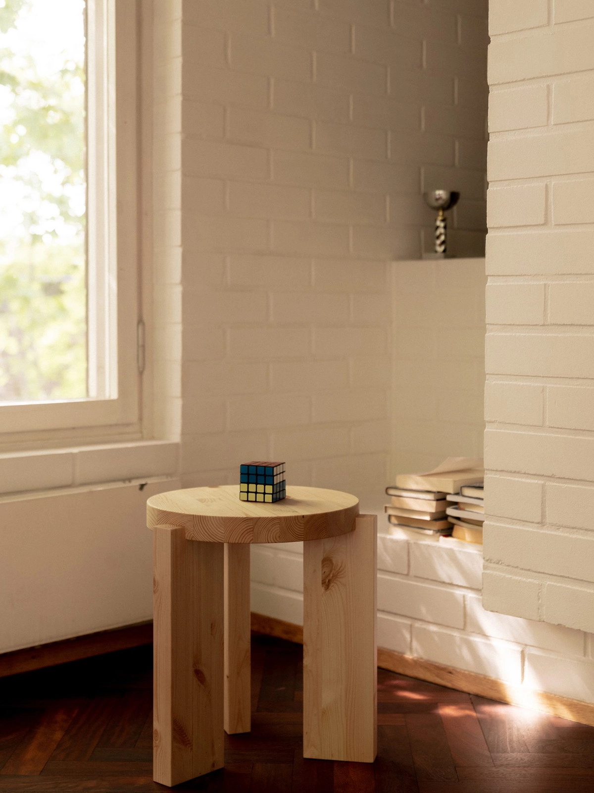 001 Stool in solid pine designed by Fredrik Paulsen for Vaarnii showing full perspective of essential form