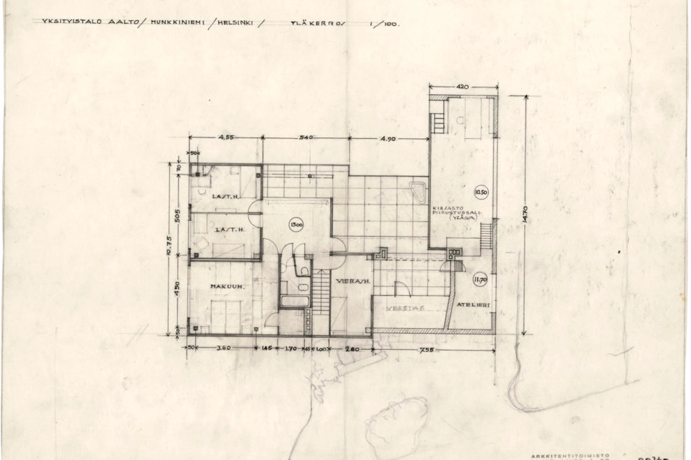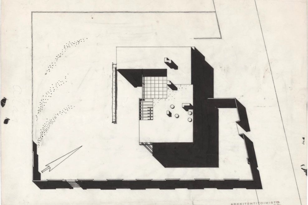 Upper floor plan. Roof terrace separates bedroom wing from the studio. Drawing © Alvar Aalto Foundation.