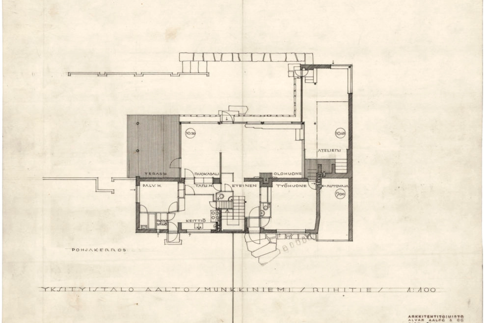 The studio, living room and dining areas, plus the kitchen and auxiliary rooms on the ground floor. Drawing © Alvar Aalto Foundation.