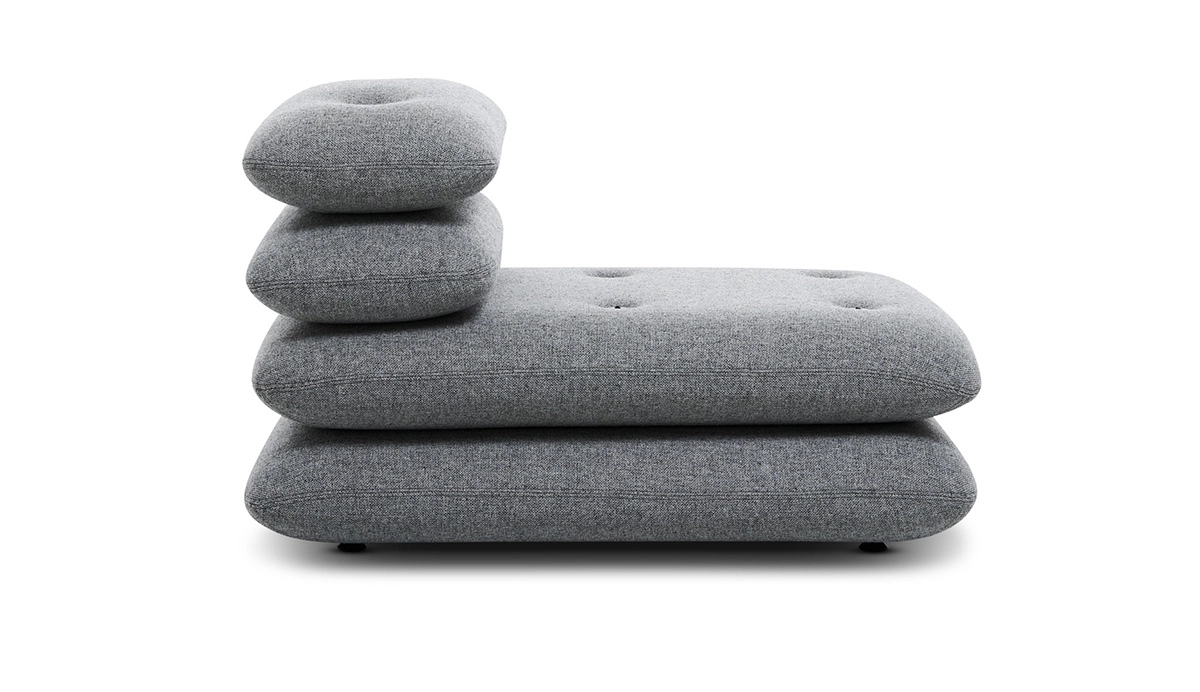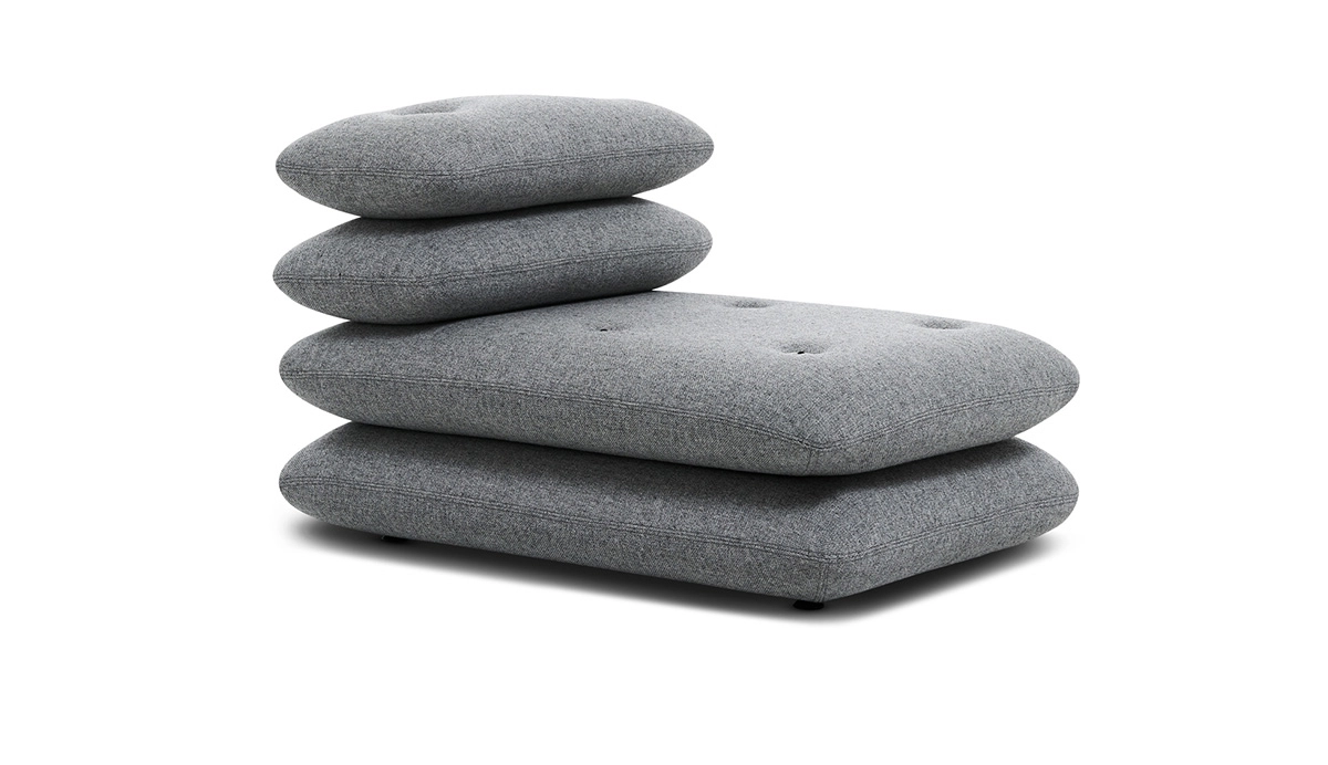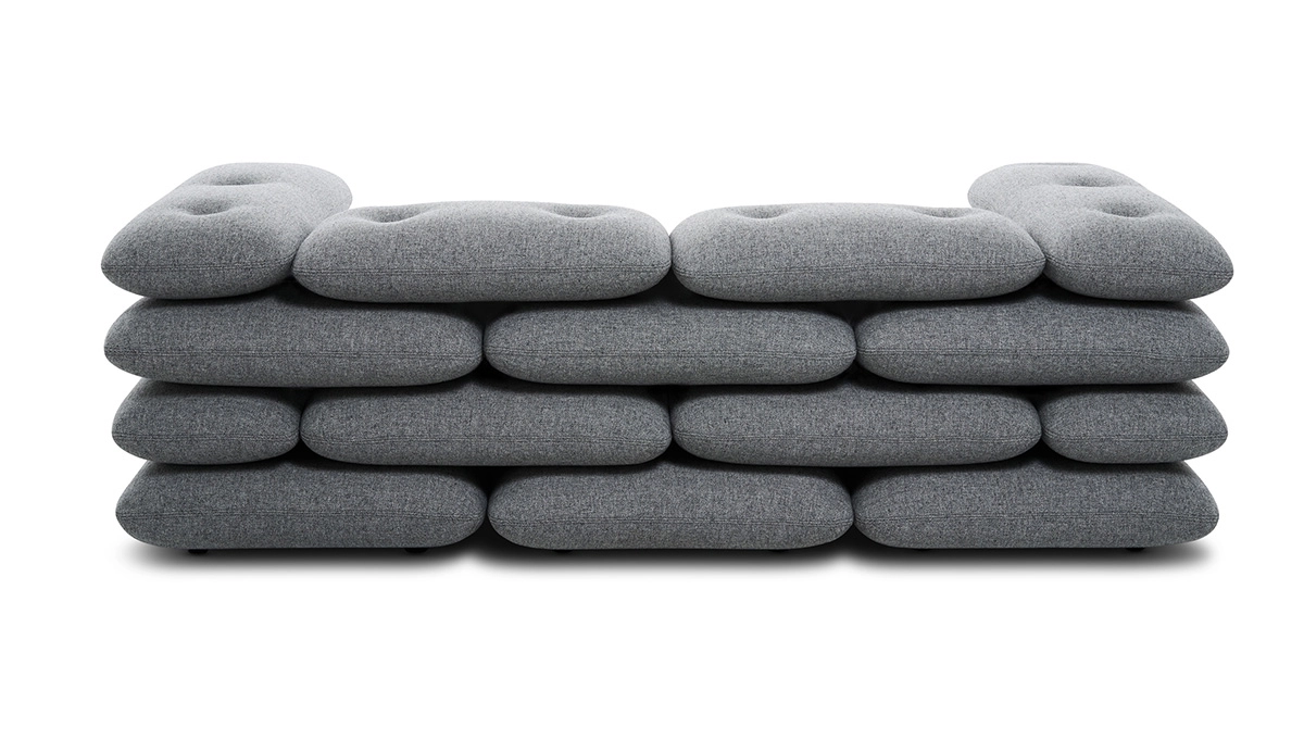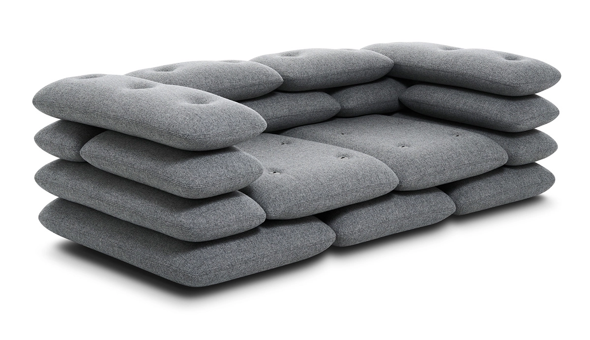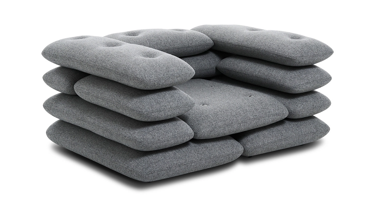 KiBiSi – Brick sofa. The series consist of pouf, chair, armchair, 2seater and 3seater sofas. KiBiSi set out to make a sofa with strong architectural references since KiBiSi partner Bjarke Ingels couldn’t really find the right architect’s sofa for his apartment. The point of departure was a classic brick bond forming the cushion pattern. The cushions are tied together and fixed with a tailor quality button. The button, also designed by KiBiSi, is molded of fiber concrete – Yet another architectural reference.