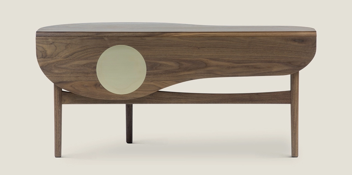 Designed in 1949, the three-legged and organically shaped coffee table is a very typical Finn Juhl design and stands as a testament to detailed beauty and craftsmanship. Opening the table is done by lifting the hanging part and sliding the whole tabletop over the base into a central position where all sides have equal amounts of support from the three legs. The very unconventional table looks deceptively delicate and is today produced in walnut with a circular brass inlay.