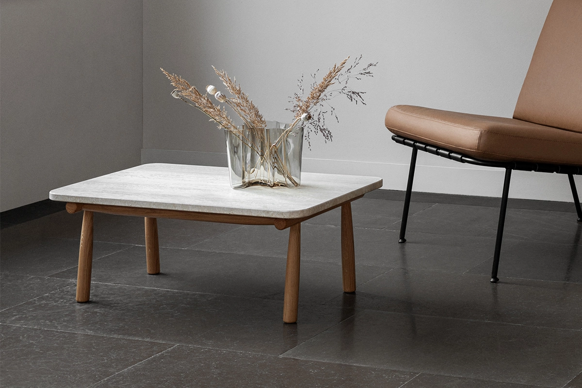 The DUX Domus Table has a limestone table top and a frame made of solid oak treated with wax oil. The Domus Table was designed in 2020 by Norm Architects to extend the DUX Domus Collection. The Domus collection also includes the revitalized Domus Chair Wood with matching footstool and Domus Chair Steel.