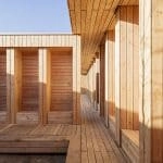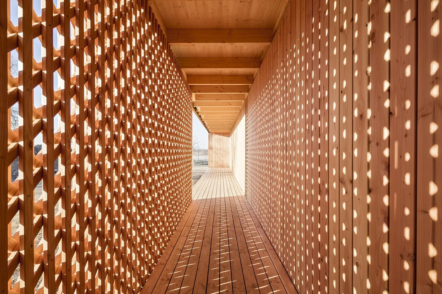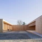 The building offers a wide variety of spaces within a very small area, allowing its users to feel at home in their own way. Covered spaces and enclosed yards are shielded from the rather dull surroundings and focus on the tree-lined road and open fields west of the camp. Structural elements, wall and ceiling surfaces, flooring and furnishings are made of untreated timber.