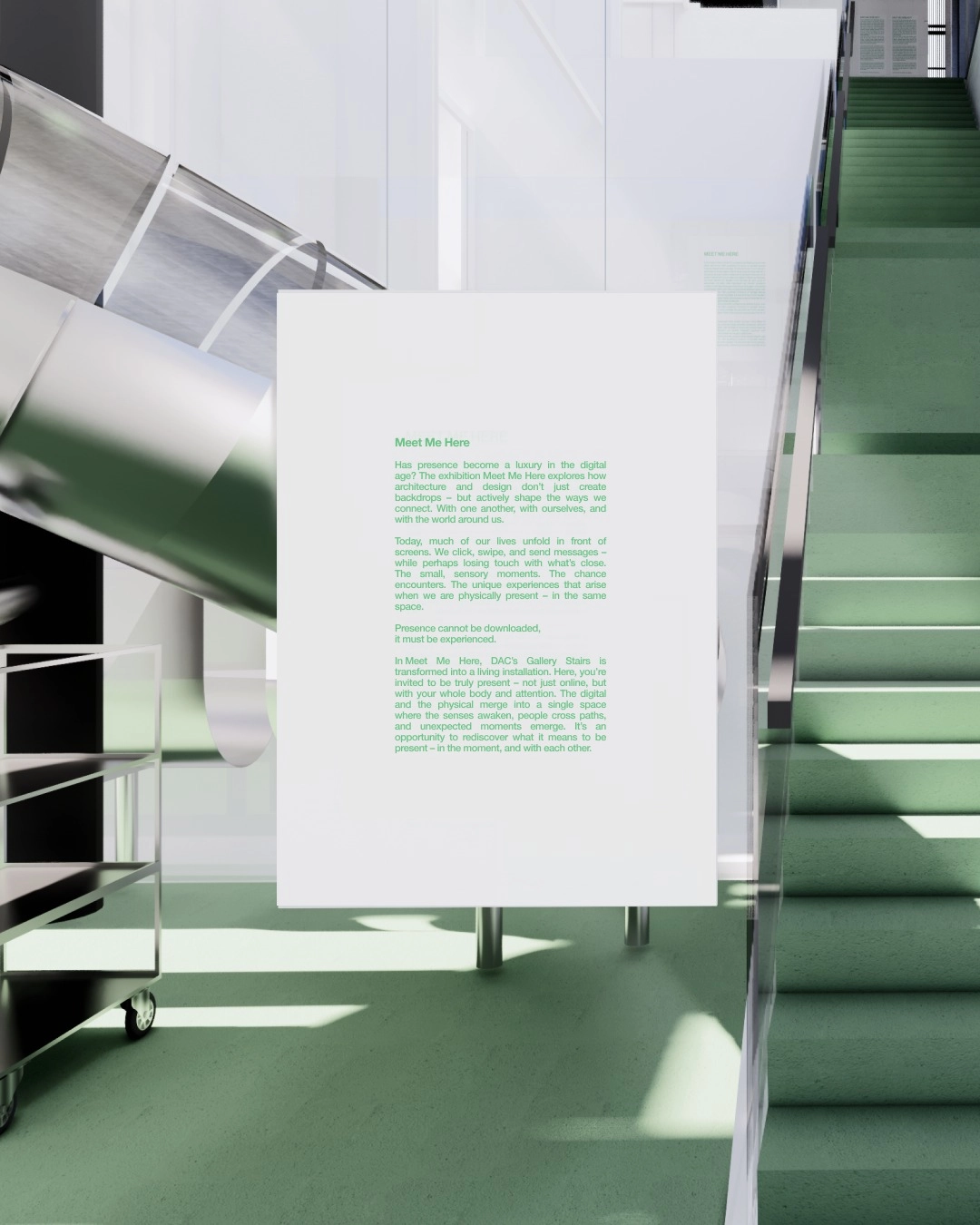 In Meet Me Here, DAC’s Gallery Stairs is transformed into a living installation. Here, you’re invited to be truly present – not just online, but with your whole body and attention. The digital and the physical merge into a single space where the senses awaken, people cross paths, and unexpected moments emerge. It’s an opportunity to rediscover what it means to be present – in the moment, and with each other.