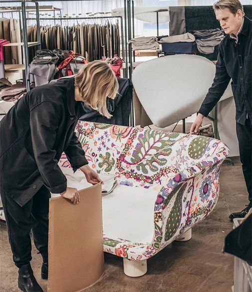 “The meeting between contemporary design and Josef Frank’s and Estrid Ericson’s classic eclecticism was the inspiration behind the shape of the sofa. The warm and homely qualities of a bed was a recurring thought, expressed in the form of the cushions. The name Famna (Embrace) refers to its generous depth and low seat height that invites you to a comfy rest with its embracing form.”